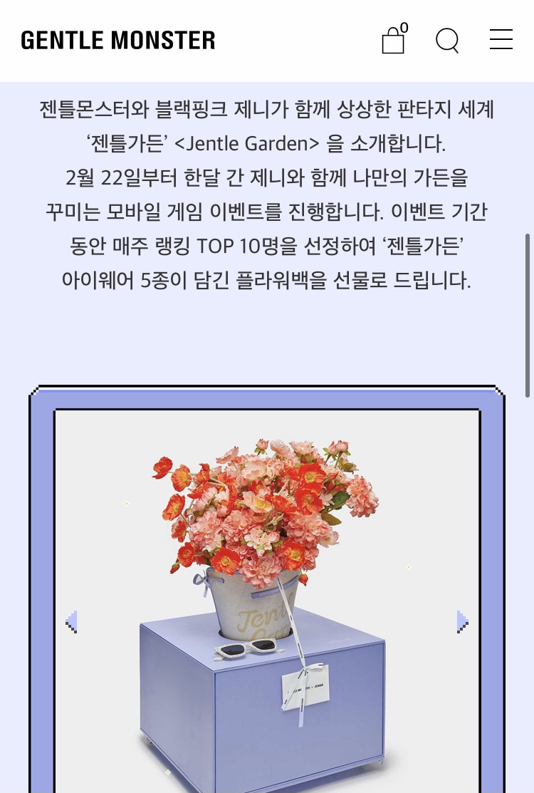 오늘부터 한달 간 나만의 가든 꾸미기 이벤트를 진행한다고 함 ㅎㅎ 매주 랭킹 탑텐에게 젠틀몬스터 아이웨어 5종이 담긴 플라워백을 당첨선물로 겟할수 있음!