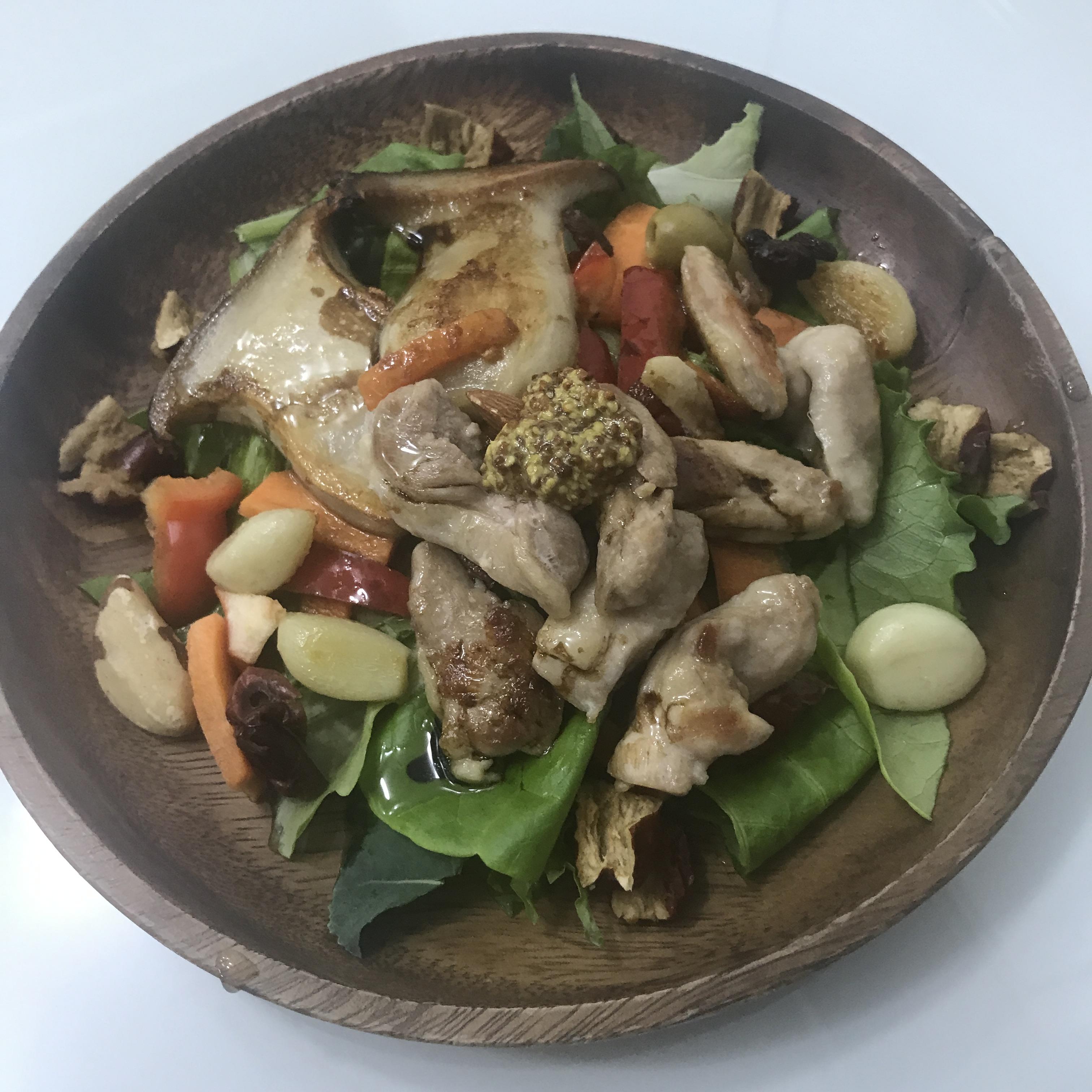 재료 : 남은 쌈야채, 버터헤드, 케일, 닭다리살, 송이버섯, 마늘, 건대추, 당근, 파프리카, 구운아몬드, 브라질호두, 건포도, 디종 홀그레인 머스터드, 올리브오일, 발사믹식초