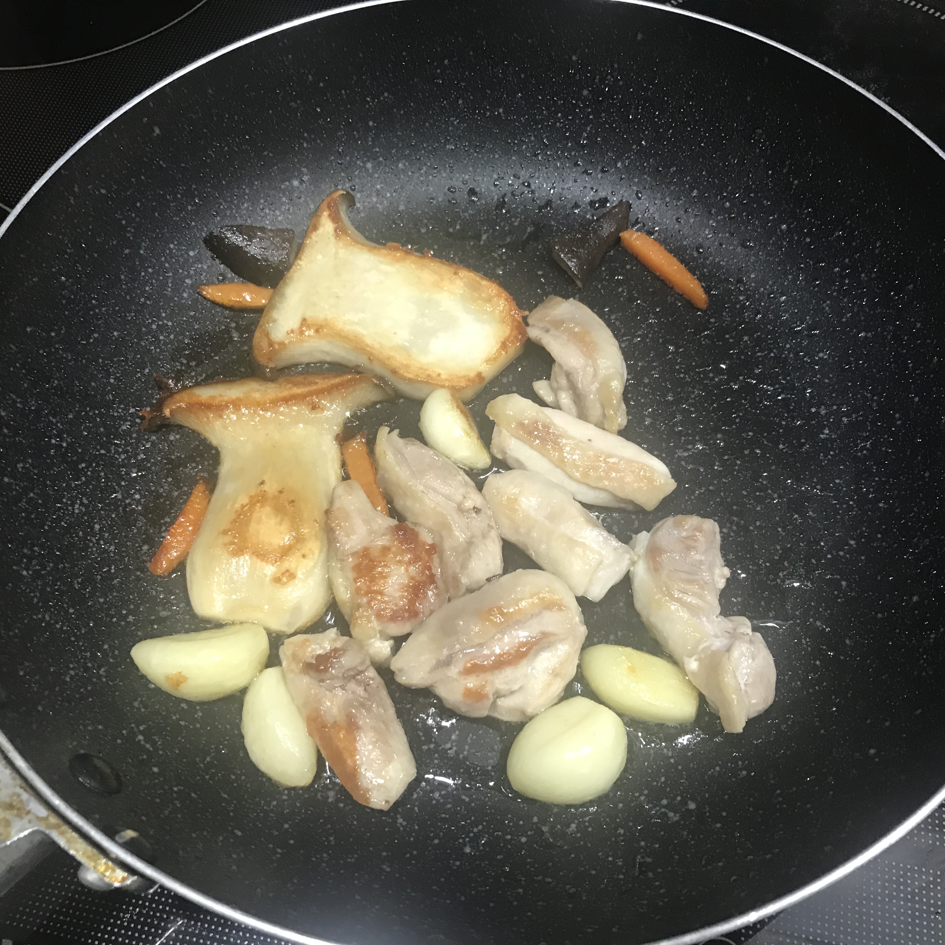 버섯과 발린 닭다리살 그리고 마늘도 구워주고