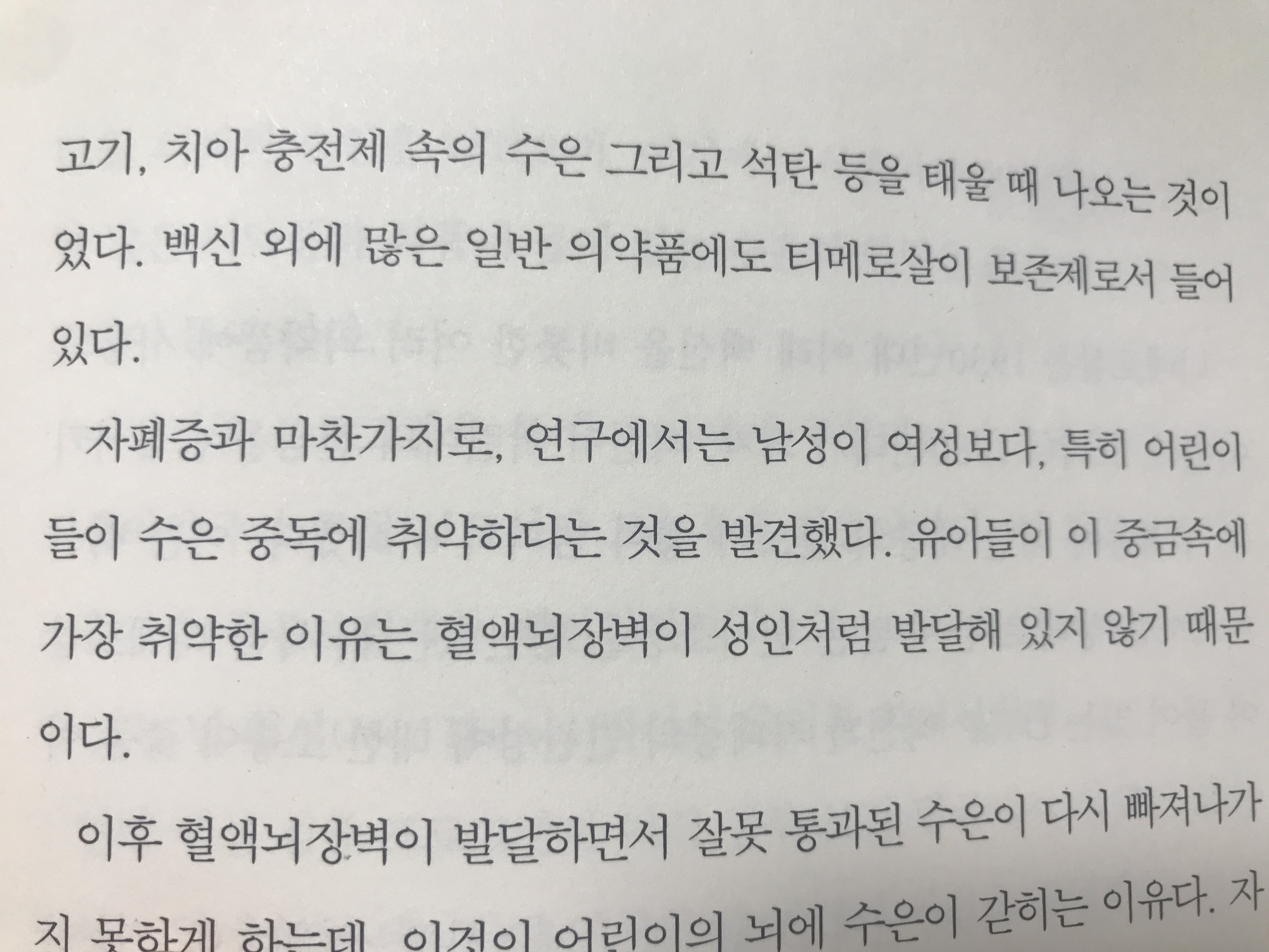 일반적으로 수은 중독의 원인은 수질 오염과 오염된 물에 사는 물고기, 치아 충전제 속의 수은 그리고 석탄 등을 태울 때 나오는 것이었다. 백신 외에 많은 일반 의약품에도 티메로살이 보존제로서 들어있다. (임신 준비중에 임신중에 치과 치료는 될수 있으면 피하자. 아기 자폐의 원인이 된다고 알고있다. 그리고 광산과 수은에 대한 내용도 충격적이였다)