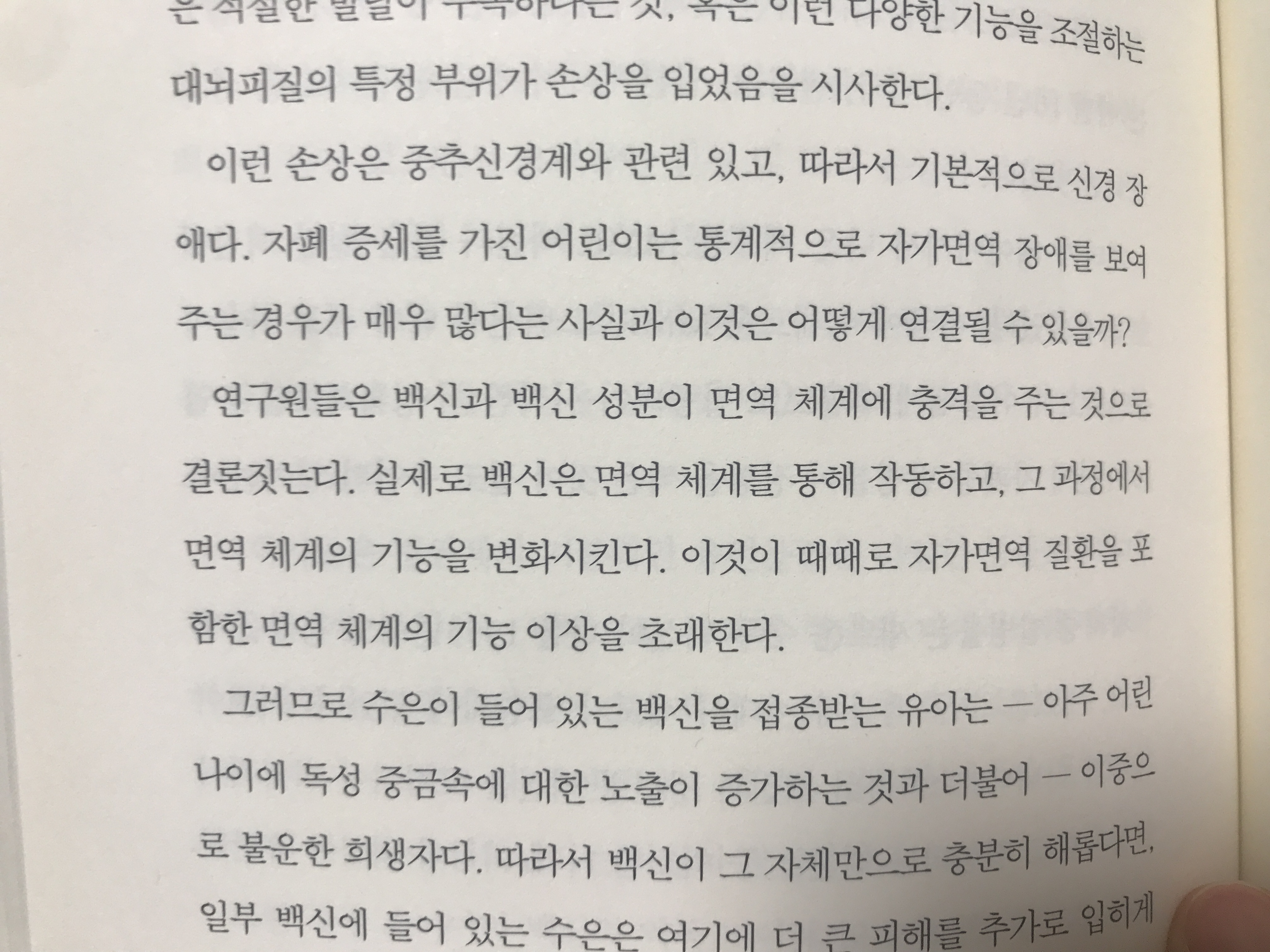 다양한 기능을 조절하는 대뇌피질의 특정 부위가 손상을 입었음을 시사한다. 이런 손상은 중추신경계와 관련 있고, 따라서 기본적으로 신경 장애다. 자폐 증세를 가진 어린이는 통계적으로 자가면역 장애를 보여주는 경우가 매우 많다는 사실과 이것은 어떻게 연결될 수 있을까? 연구원들은 백신과 백신 성분이 면역 체계에 충격을 주는 것으로 결론짓는다. 실제로 백신은 면역 체계를 통해 작동하고, 그 과정에서 면역 체계의 기능을 변화시킨다. 이것이 때때로 자가면역 질환을 포함한 면역 체계의 기능 이상을 초래한다. 그러므로 수은이 들어 있는 백신을 접종받는 유아는 아주 어린 나이에 독성 중금속에 대한 노출이 증가하는 것과 더불어 이중으로 불운한 희생자다. 따라서 백신이 그 자체만으로 충분히 해롭다면, 일부 백신에 들어 있는 수은은 여기에 더 큰 피해를 추가로 입히게 된다.