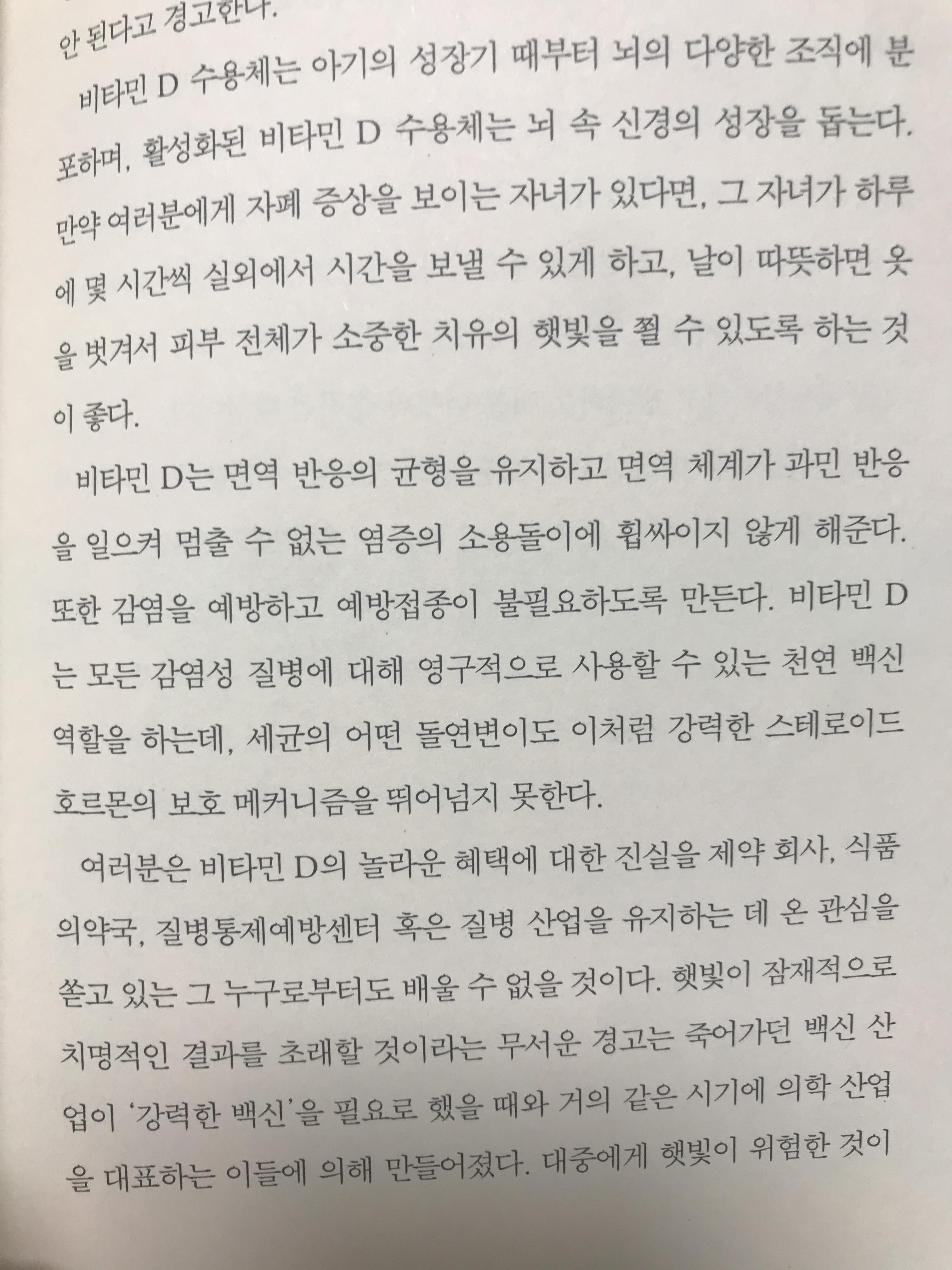 비타민D는 면역 반응의 균형을 유지하고 면역 체계가 과민 반응을 일으켜 멈출 수 없는 염증의 소용돌이에 휩싸이지 않게 해준다. 또한 감염을 예방하고 예방접종이 불필요하도록 만든다. 비타민D는 모든 감염성 질병에 대해 영구적으로 사용할 수 있는 천연 백신 역활을 하는데, 세균의 어떤 돌연변이도 이처럼 강력한 스테로이드 호르몬의 보호 메커니즘을 뛰어넘지 못한다. (천연 백신이라니 너무 멋진 단어 아닌가 햇빛 광합성을 해야겠다 왜 등산객들이 그렇게 많은지 이해가 됨)