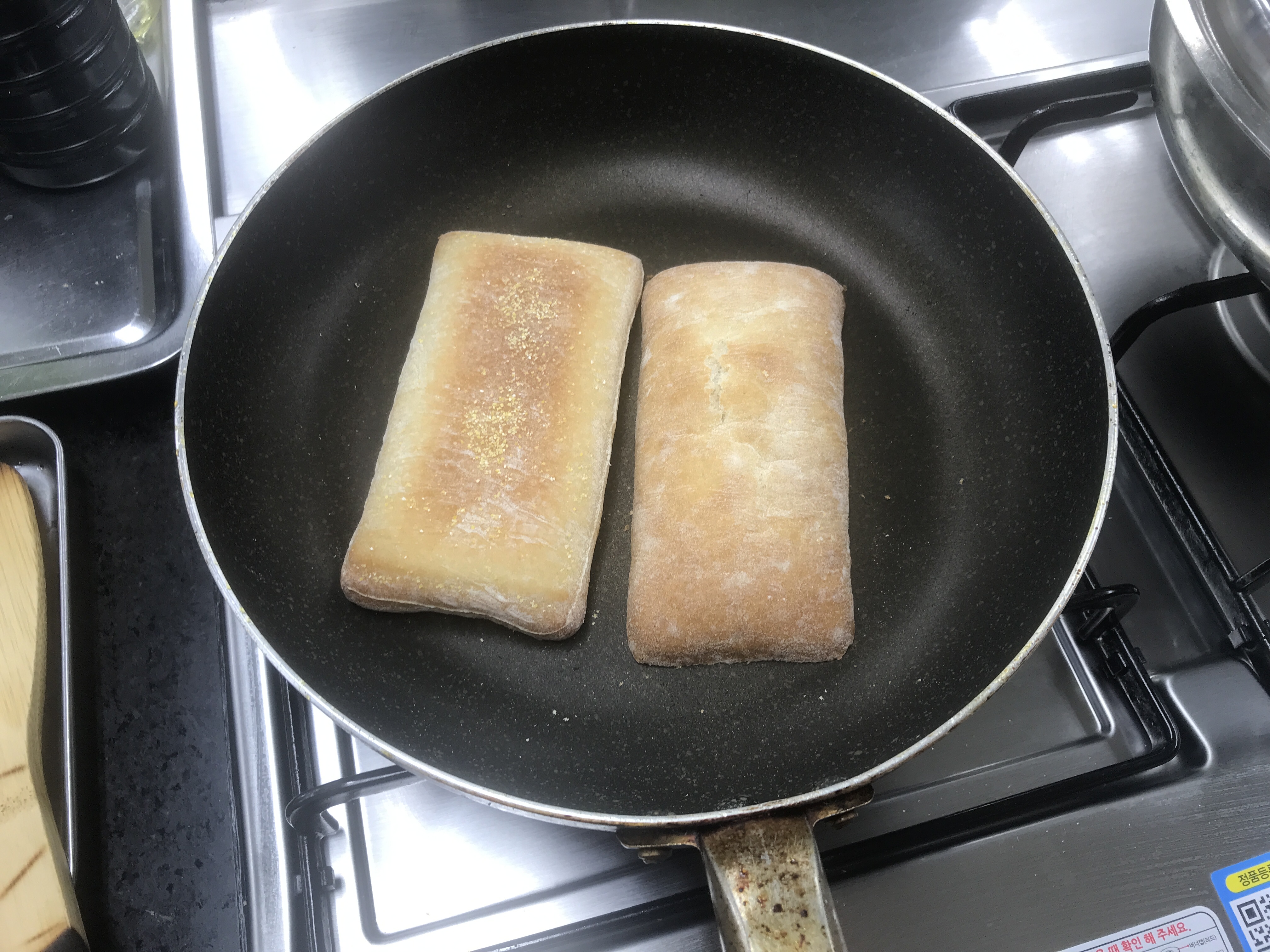 치아바타 빵은 반으로 컷팅해서 팬에 타지않게 굽기