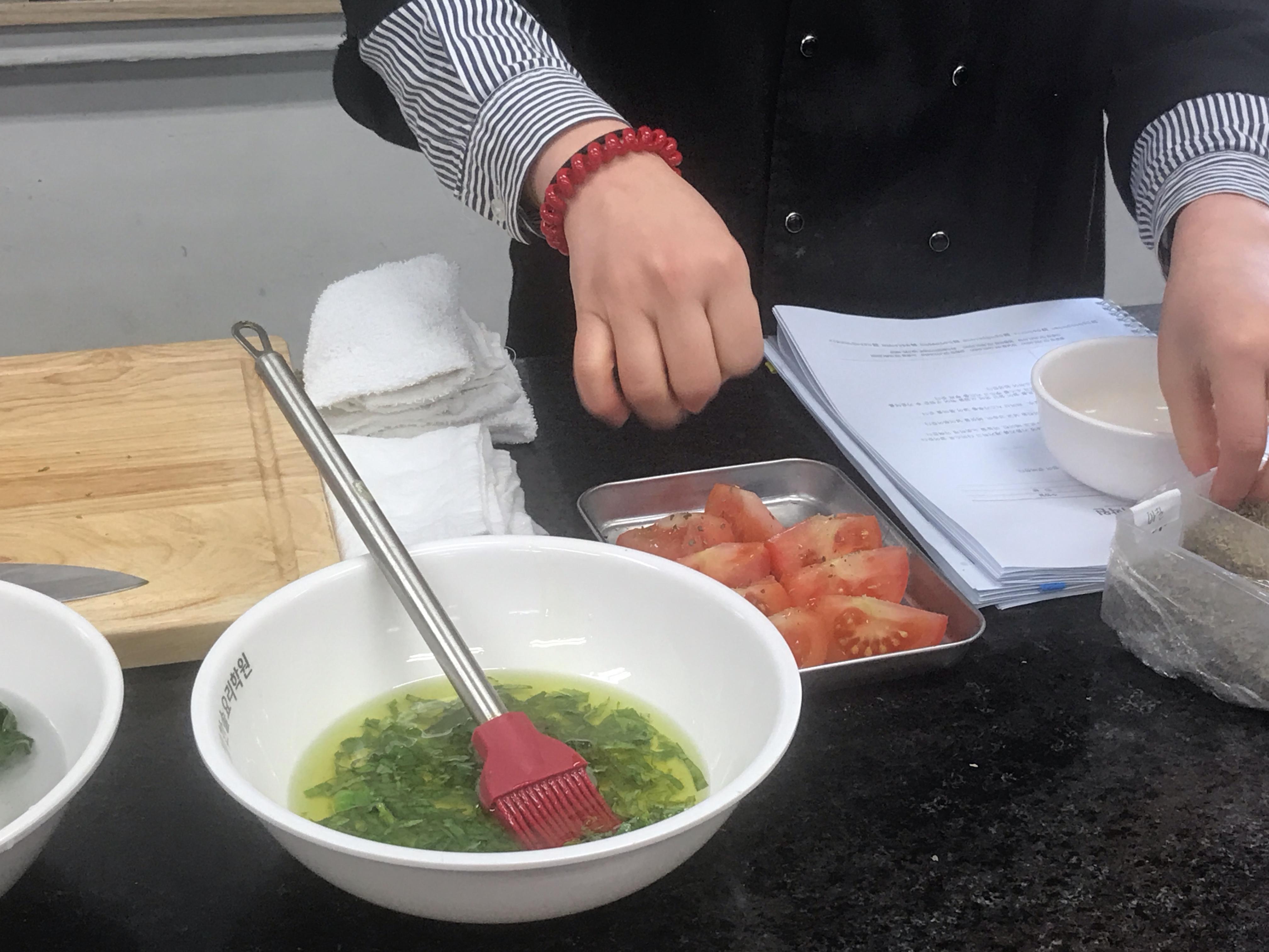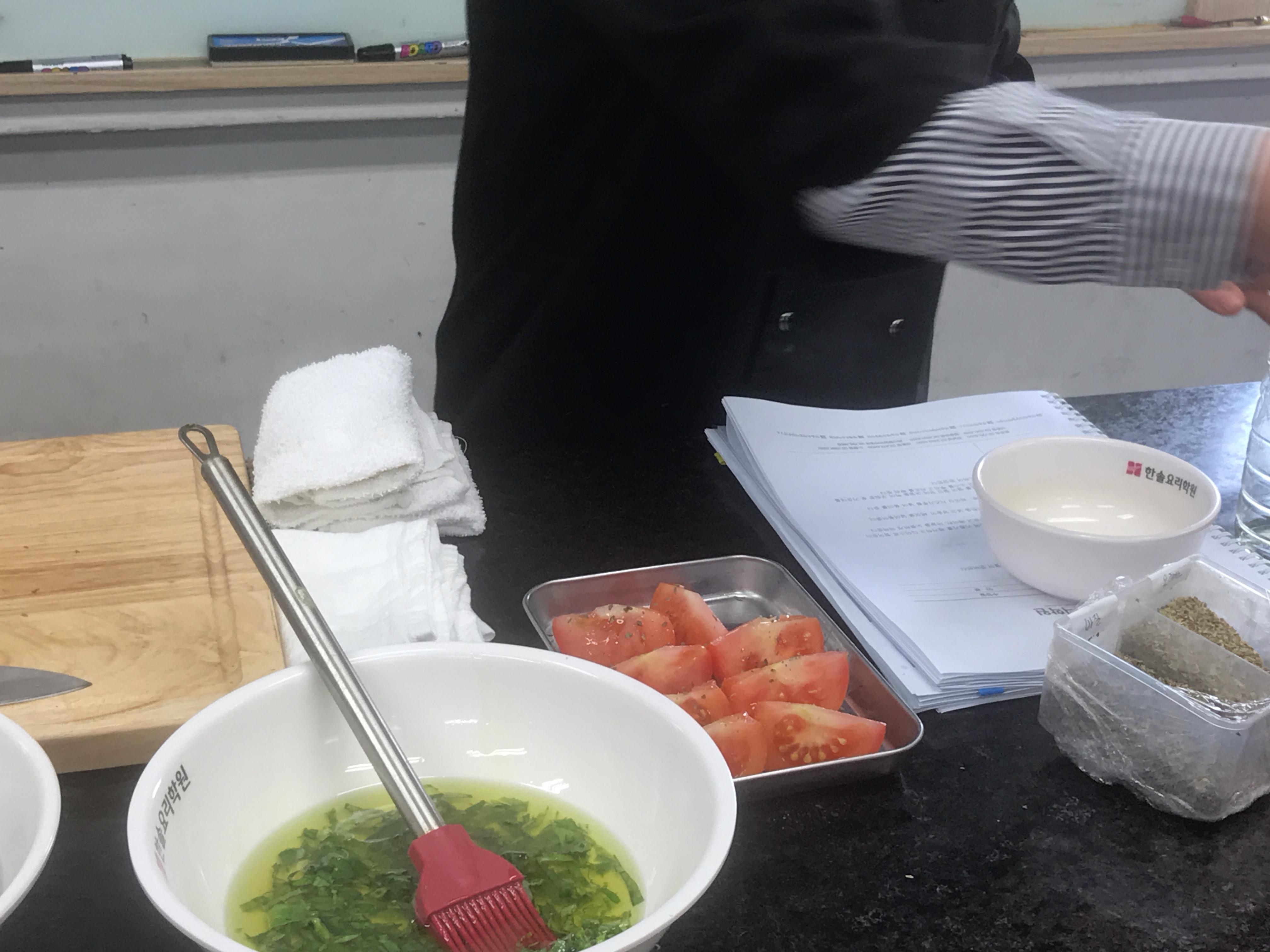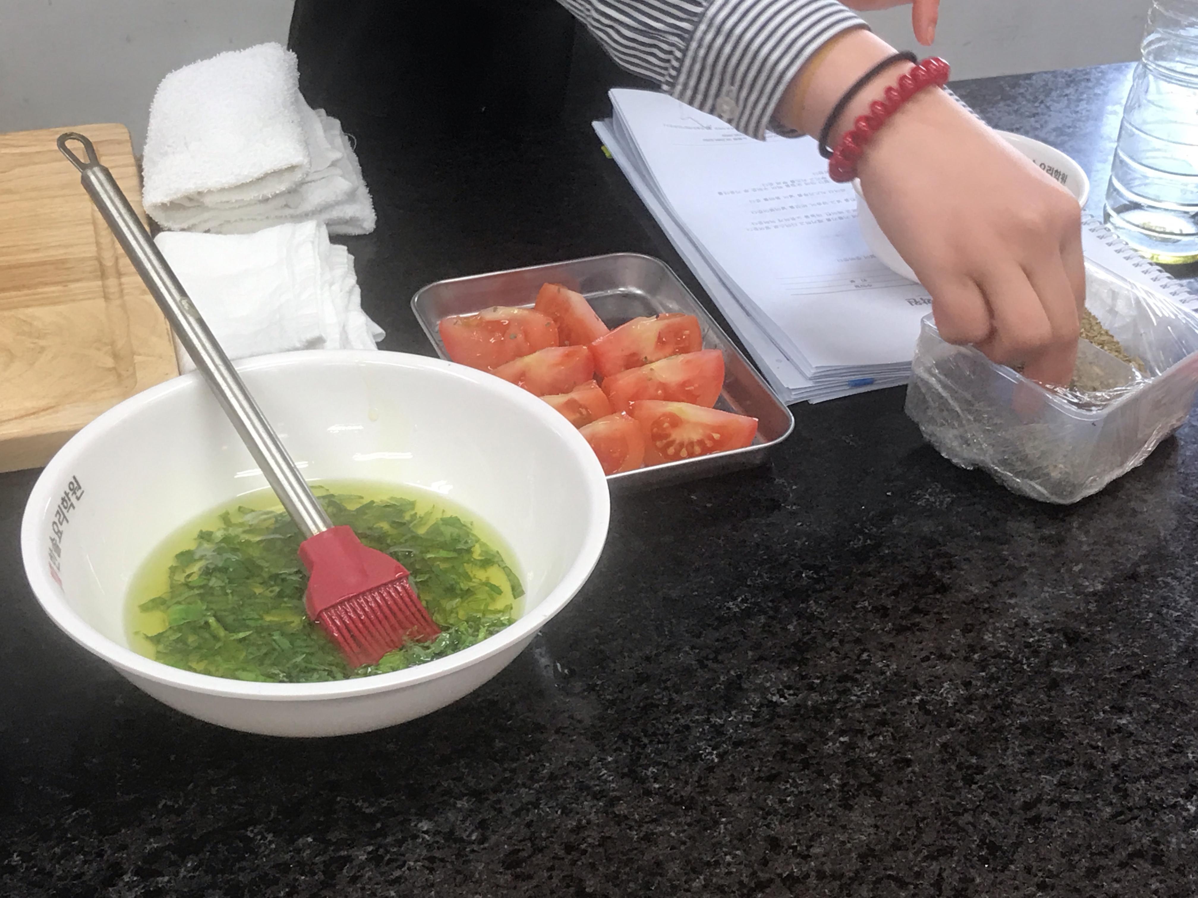 바질 올리브오일을 토마토 위에 발라주기