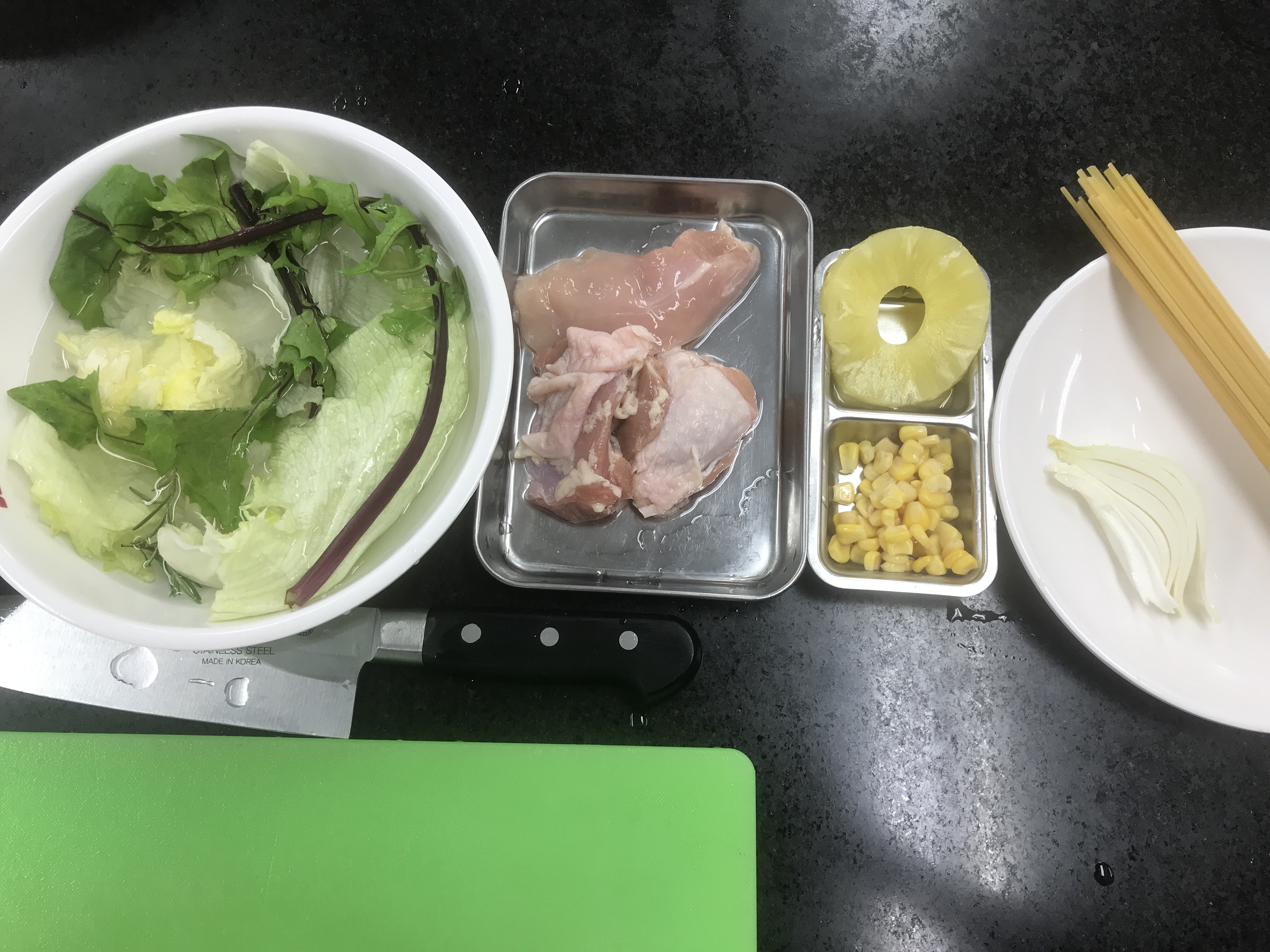 양상추 치커리 치킨 파인애플 옥수수 양파 스파게티