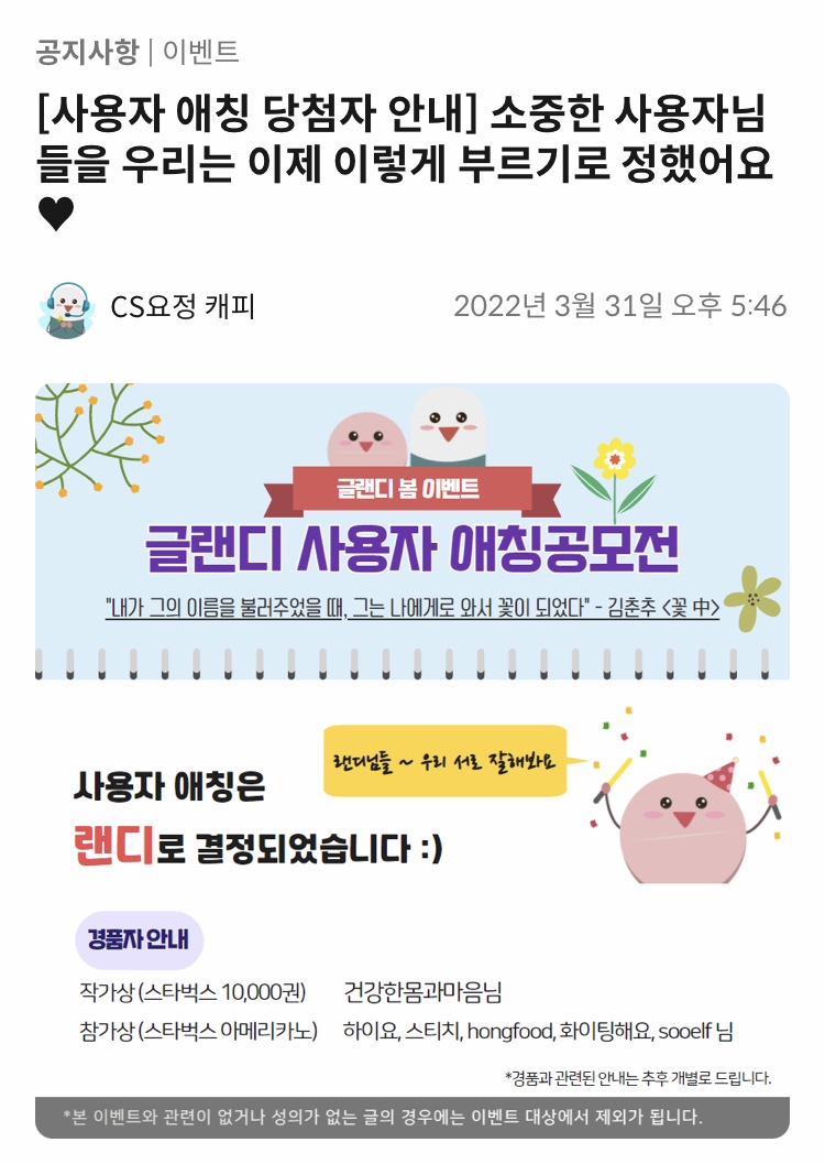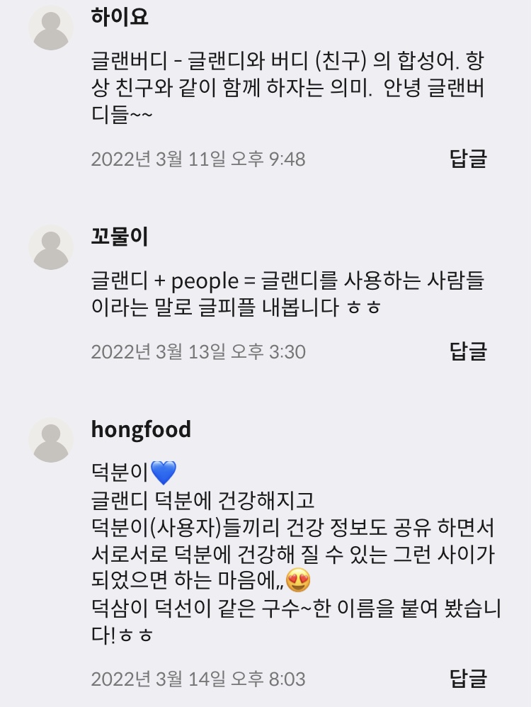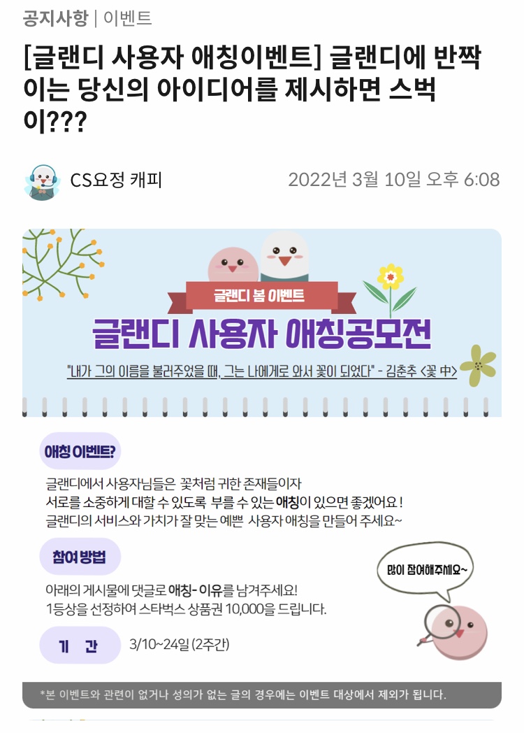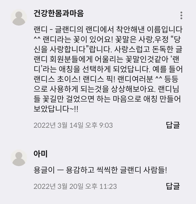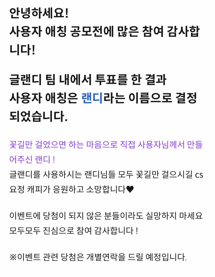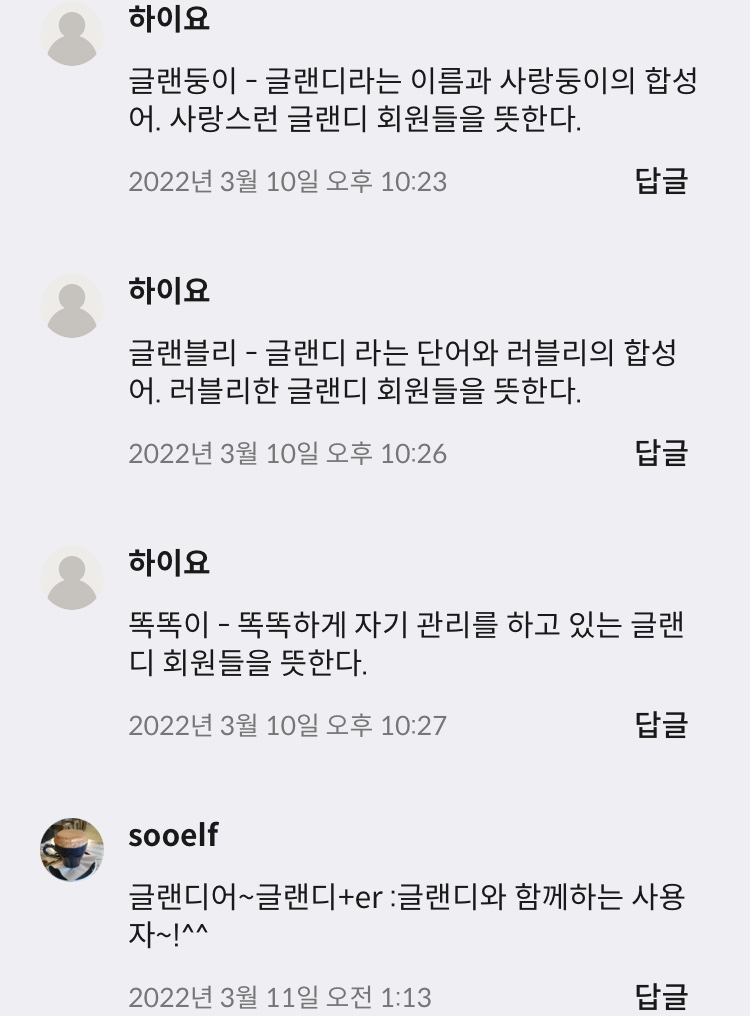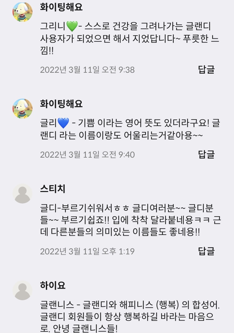 글랜디 서비스와 가치가 잘 맞는 예쁜 사용사 애칭 만들기 미션~!