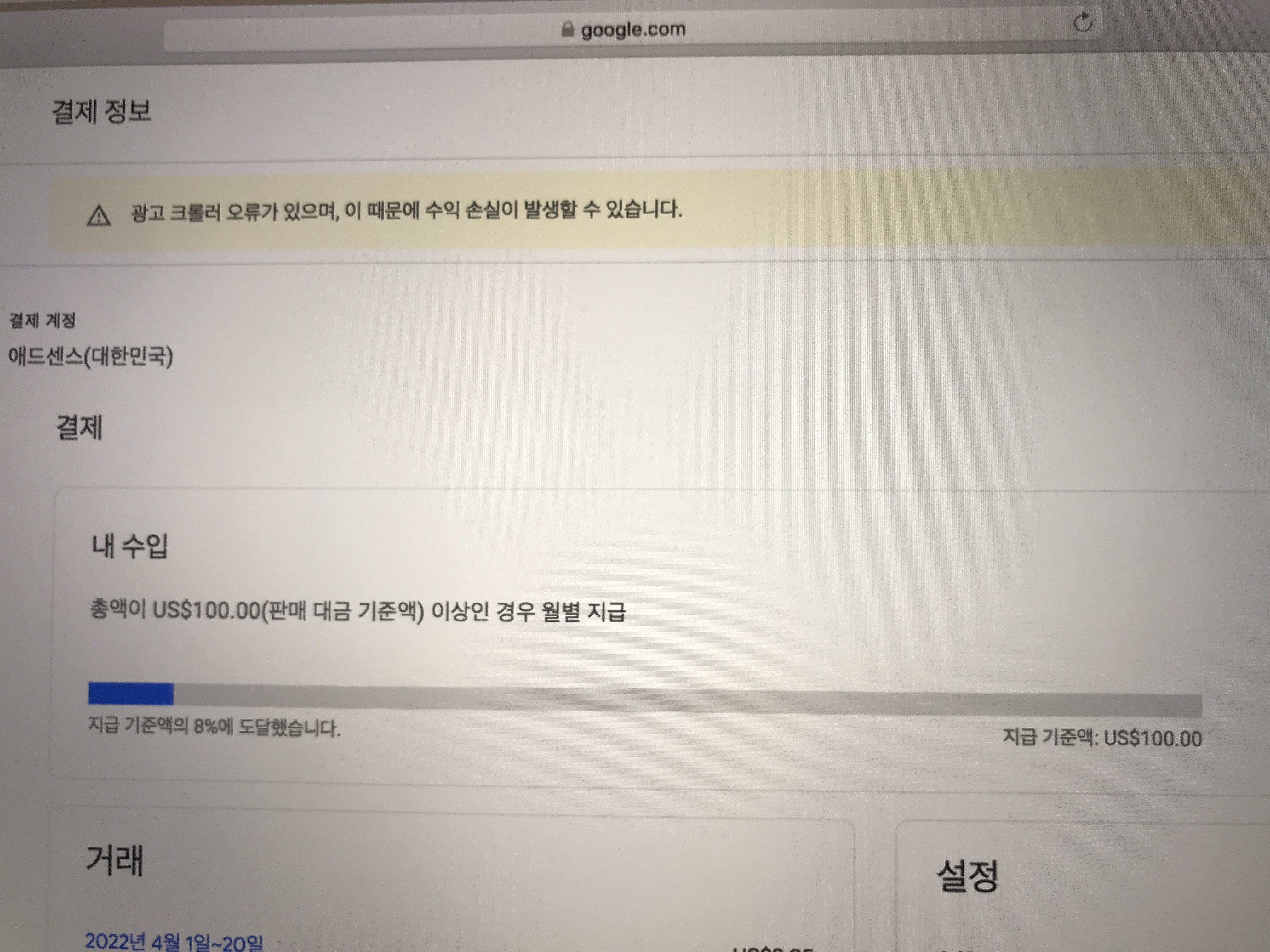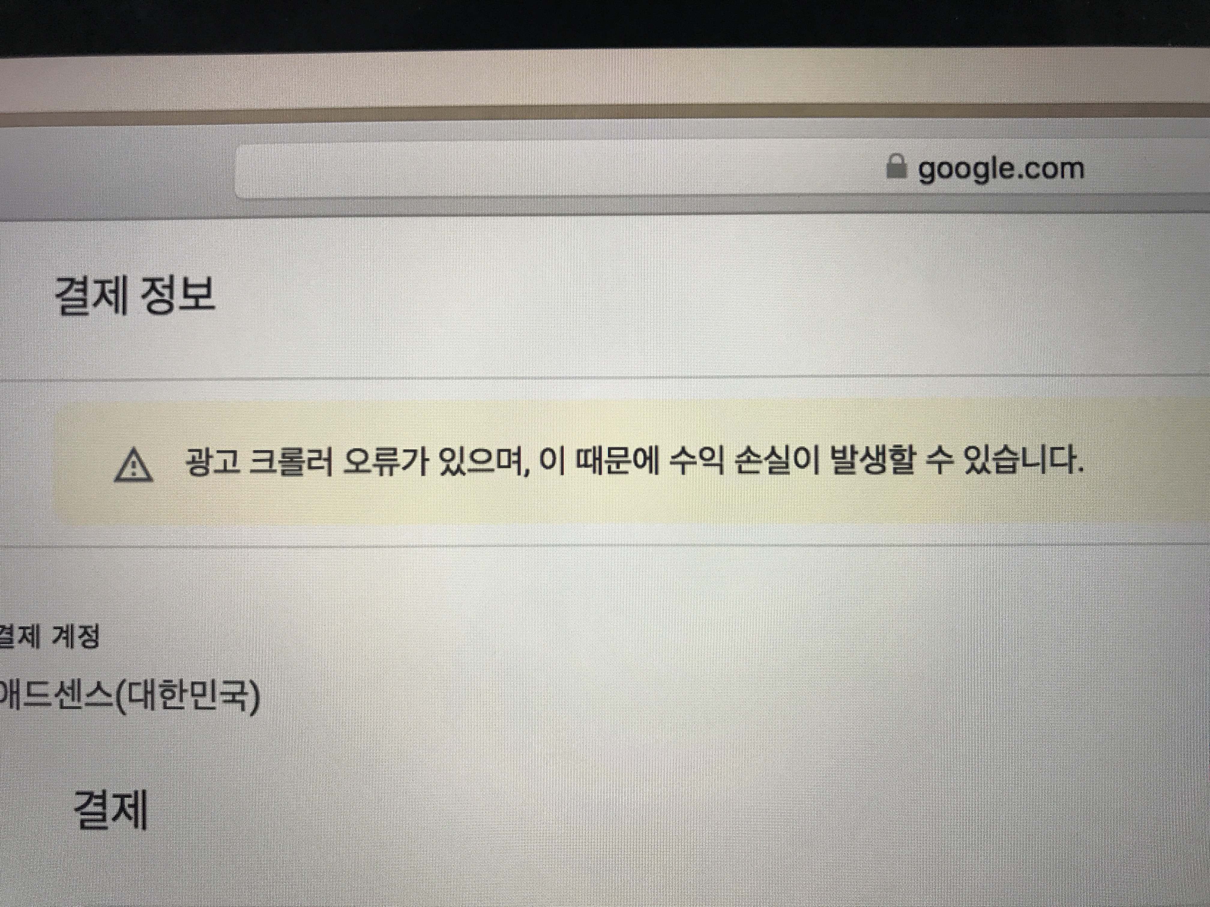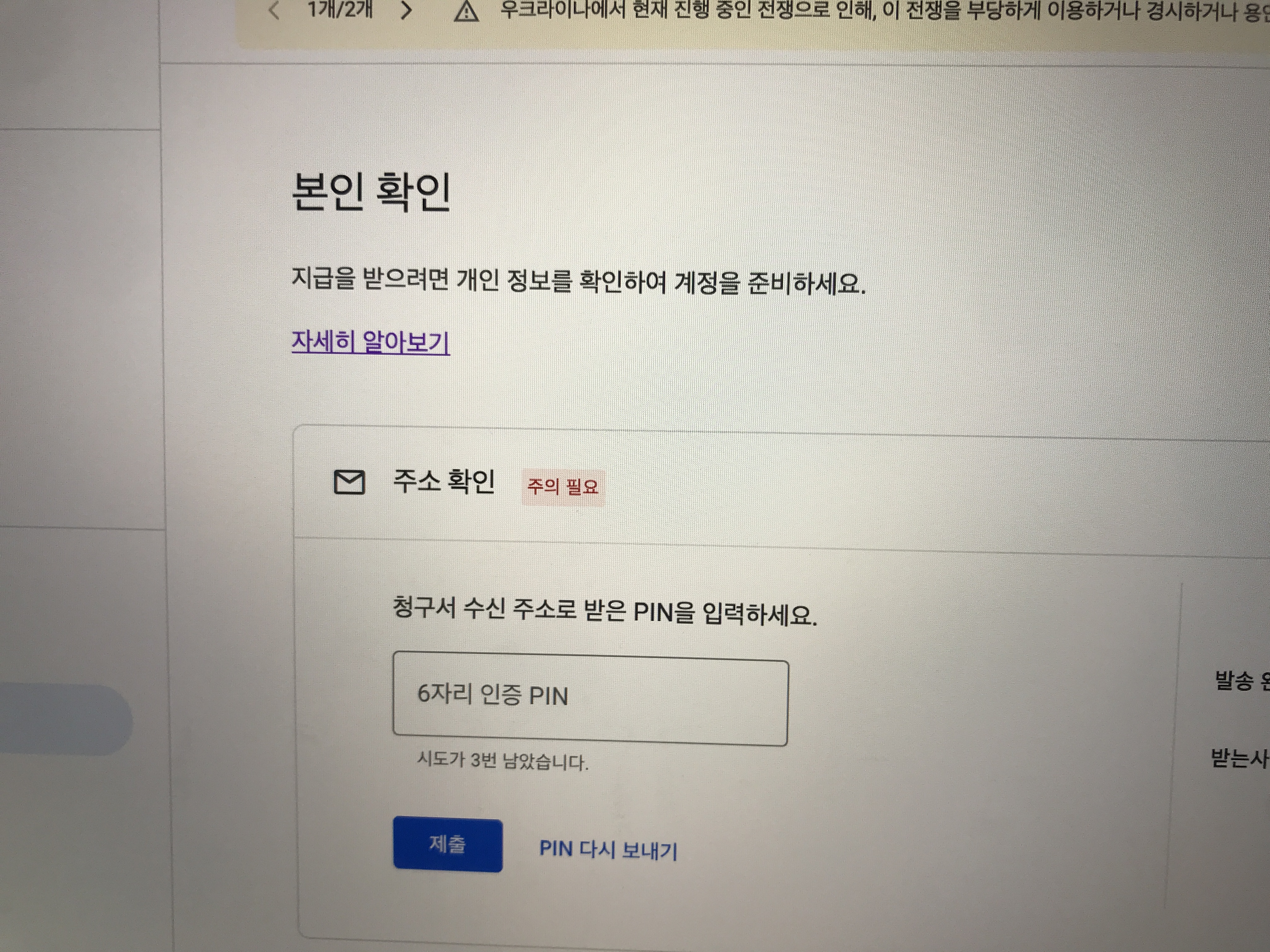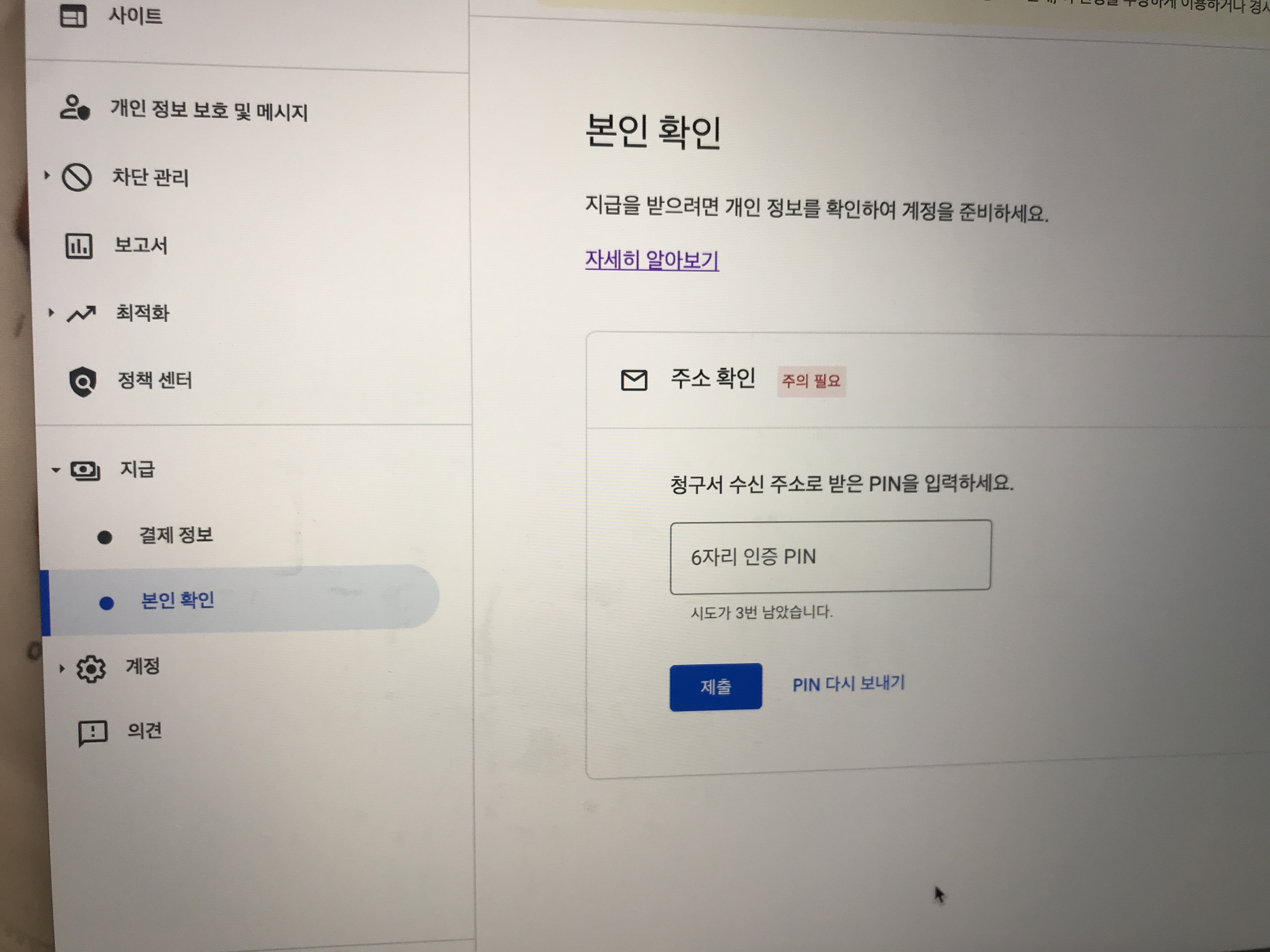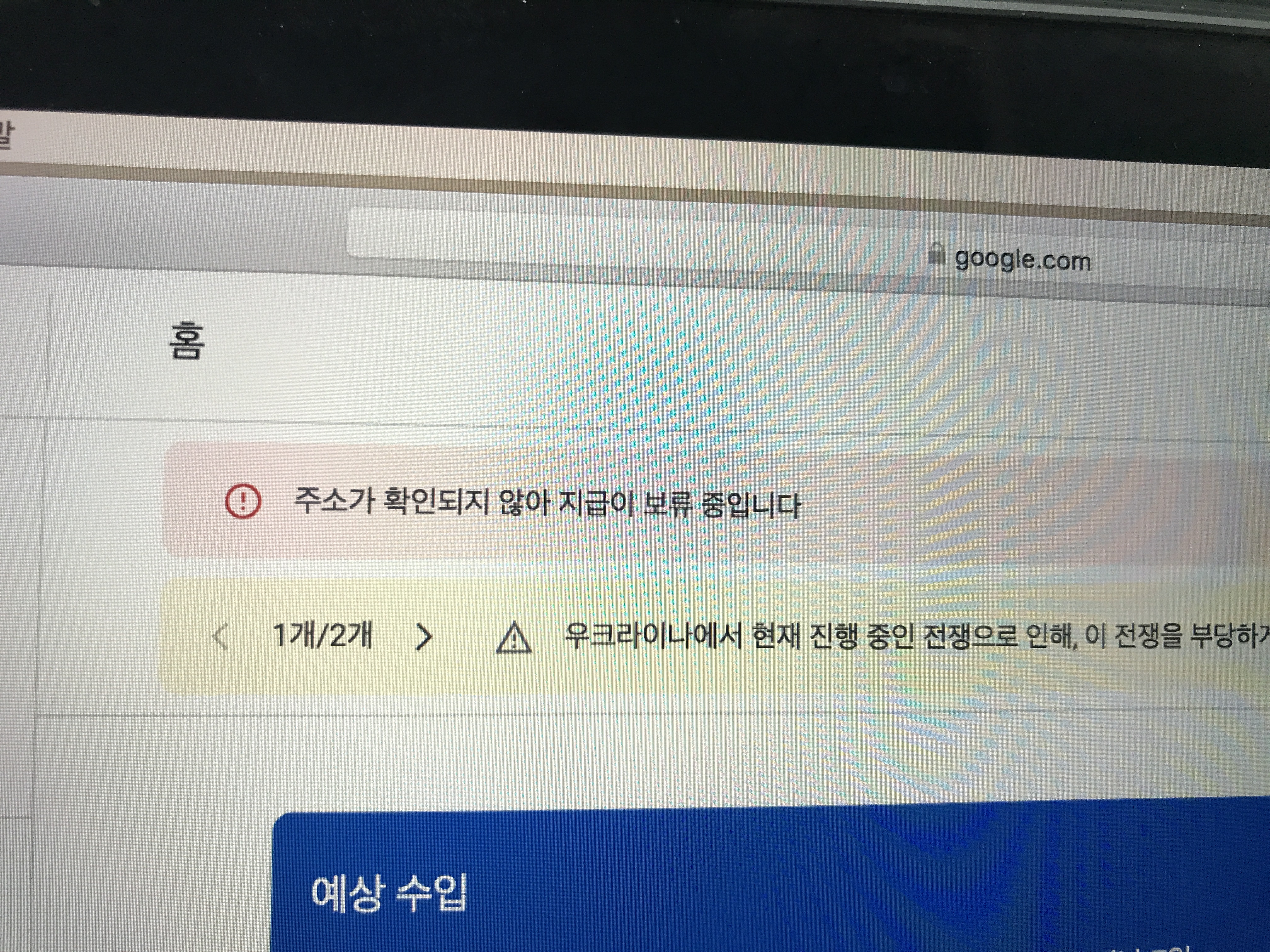 구글 애드센스 메인화면에 주소가 확인되지 않아 지급이 보류 중이라는 문구가 보이고