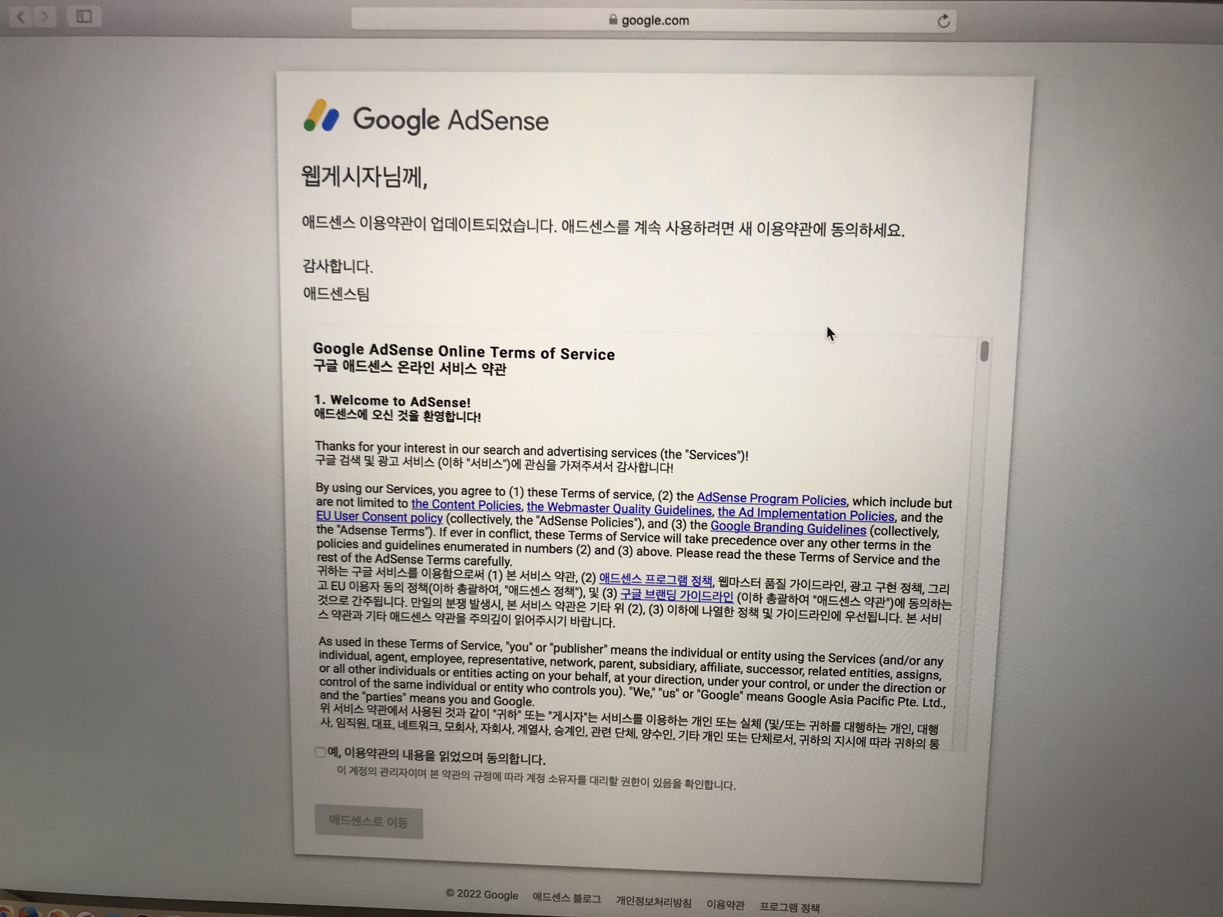 마침 애드센스 이용약관도 업데이트 되어 동의체크 해주고 입장~