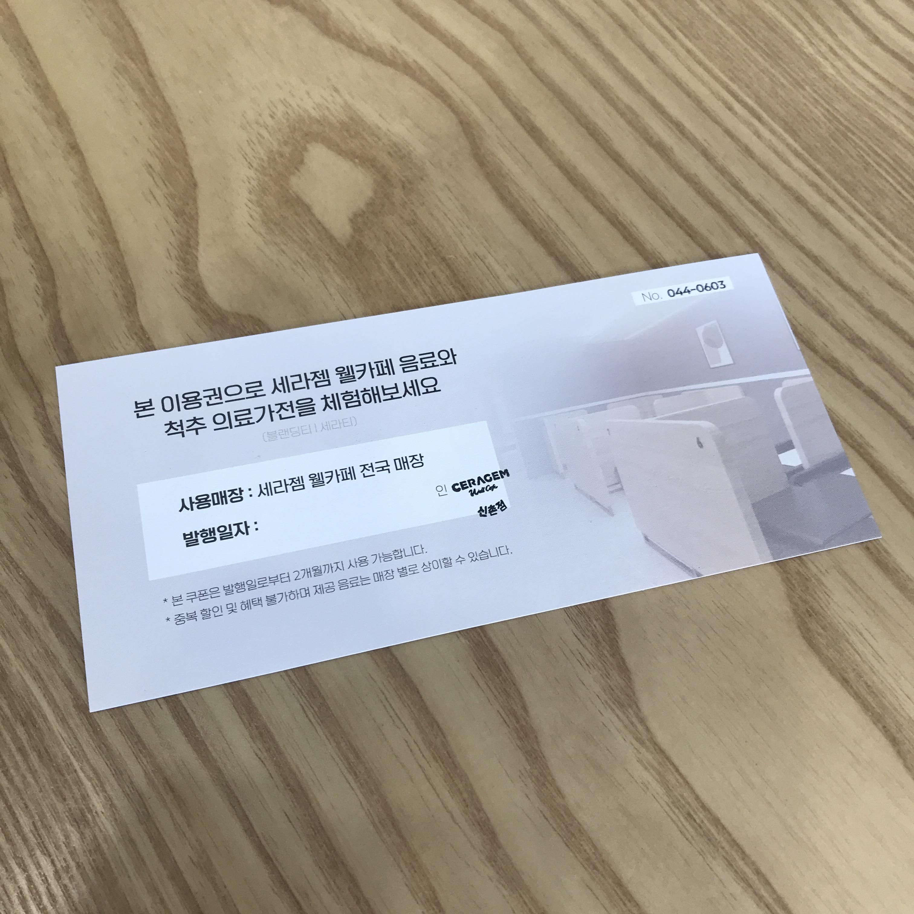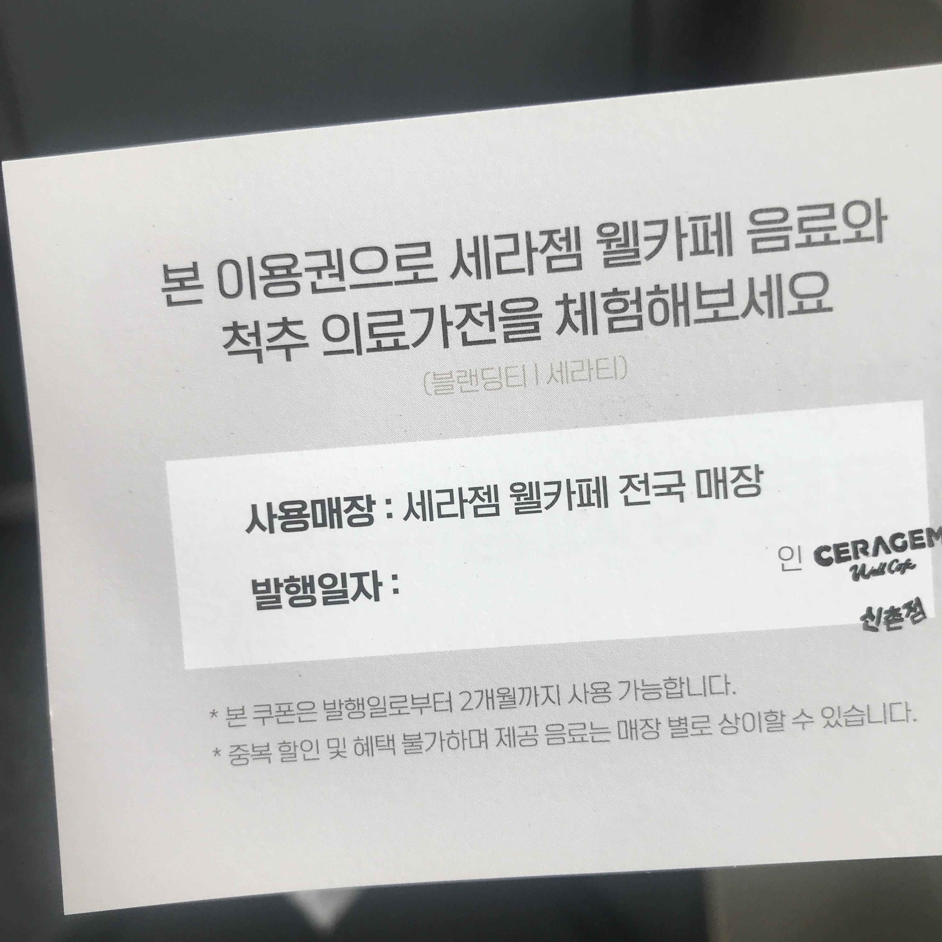 어느날 세라젬 무료 음료&체험쿠폰이 문자가 와 있어서 운동가면서 오랜만에 들린 신촌 세라젬 웰카페 :) 이젠 이전처럼 당황하지 않고 당당하게 입장하기 ㅎㅎ