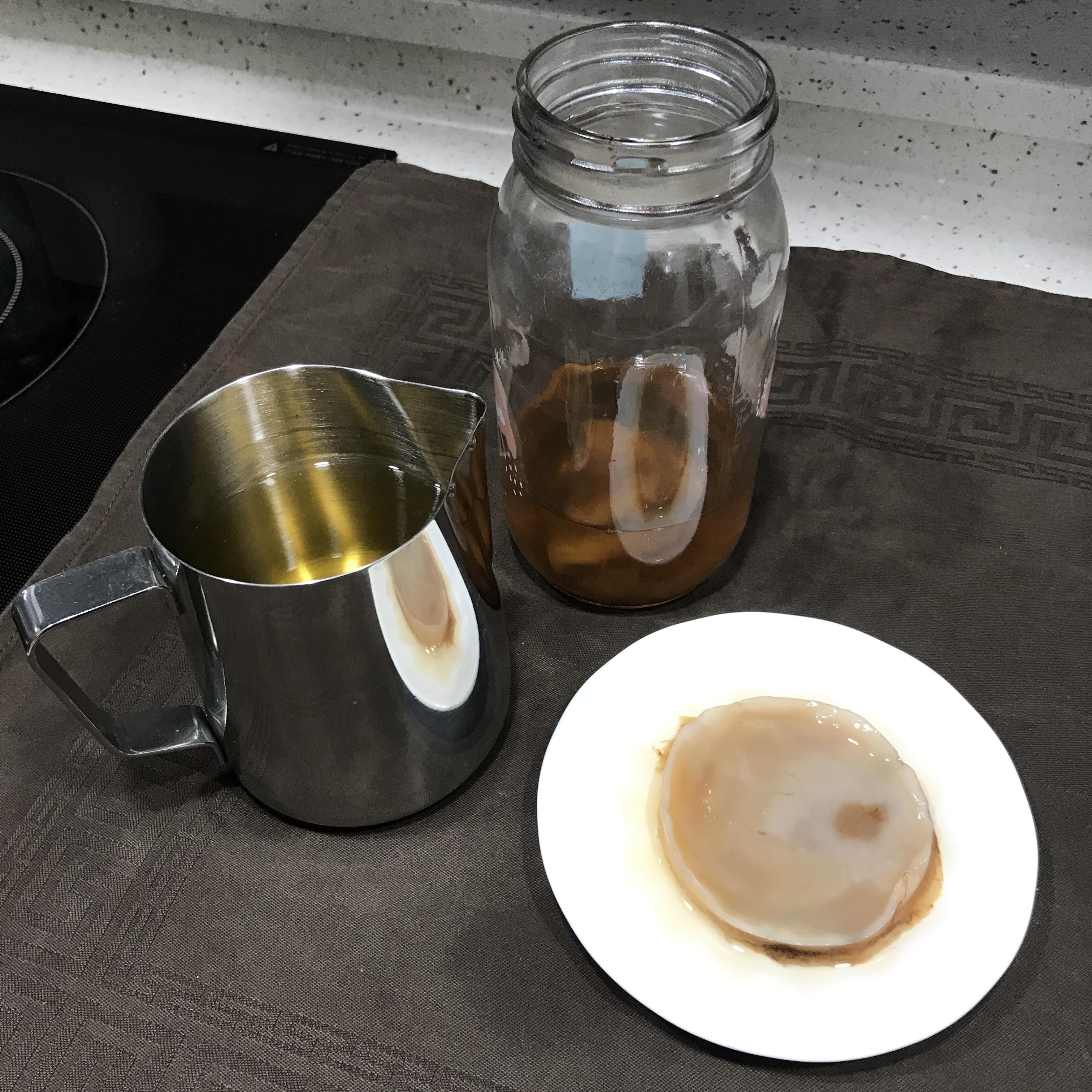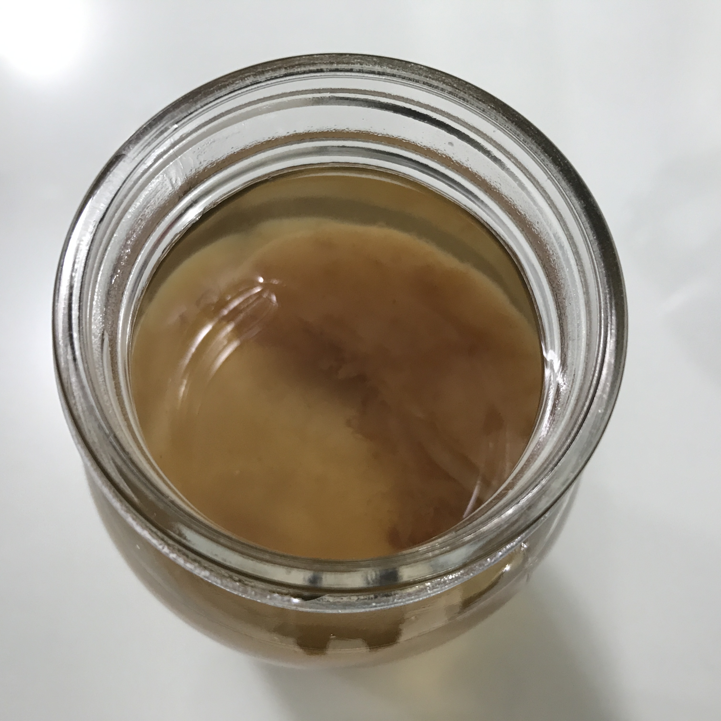 재배양했던 병이 너무 지저분해져서 세척하는 사이 옮겨둔 (왼쪽)우리집에서 태어난 아기 콤부차 보름달이와 (오른쪽)엄마 콤부차 종균 반달이ㅎㅎ