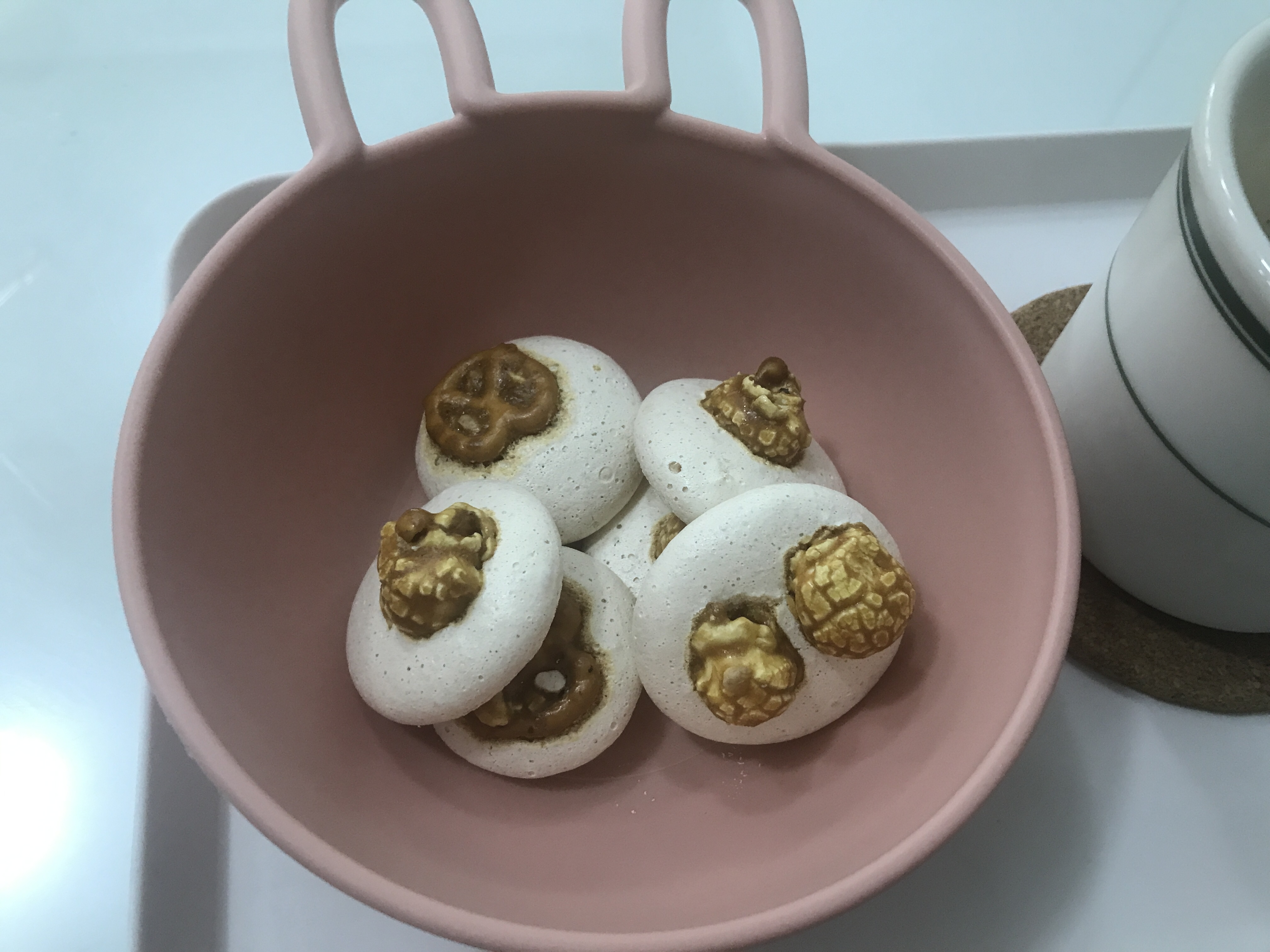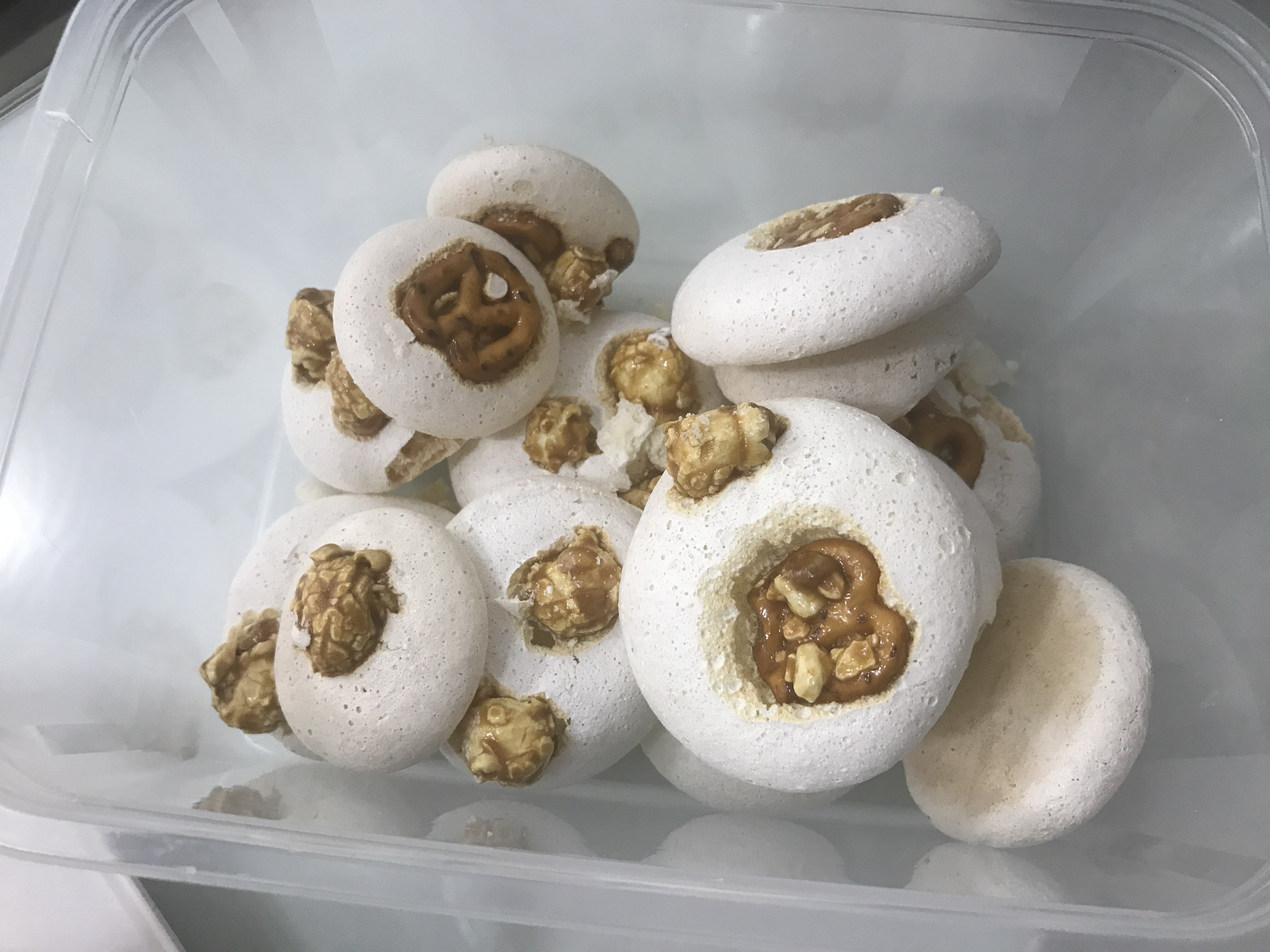카라멜에 빠진 팝콘과 프레첼 머랭쿠키가