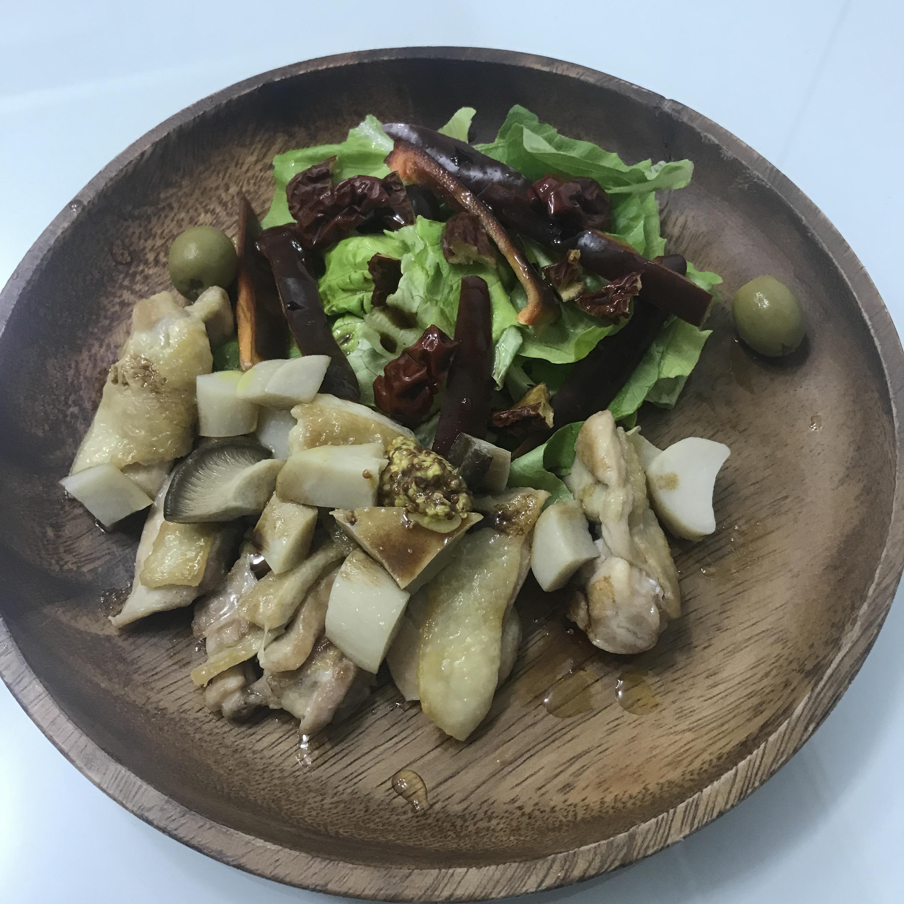 재료 : 닭다리살 송이버섯 대추 핏빛파프리카 버터헤드레튜스 그린올리브 디종홀그레인머스터드소스 올리브오일 발사믹식초