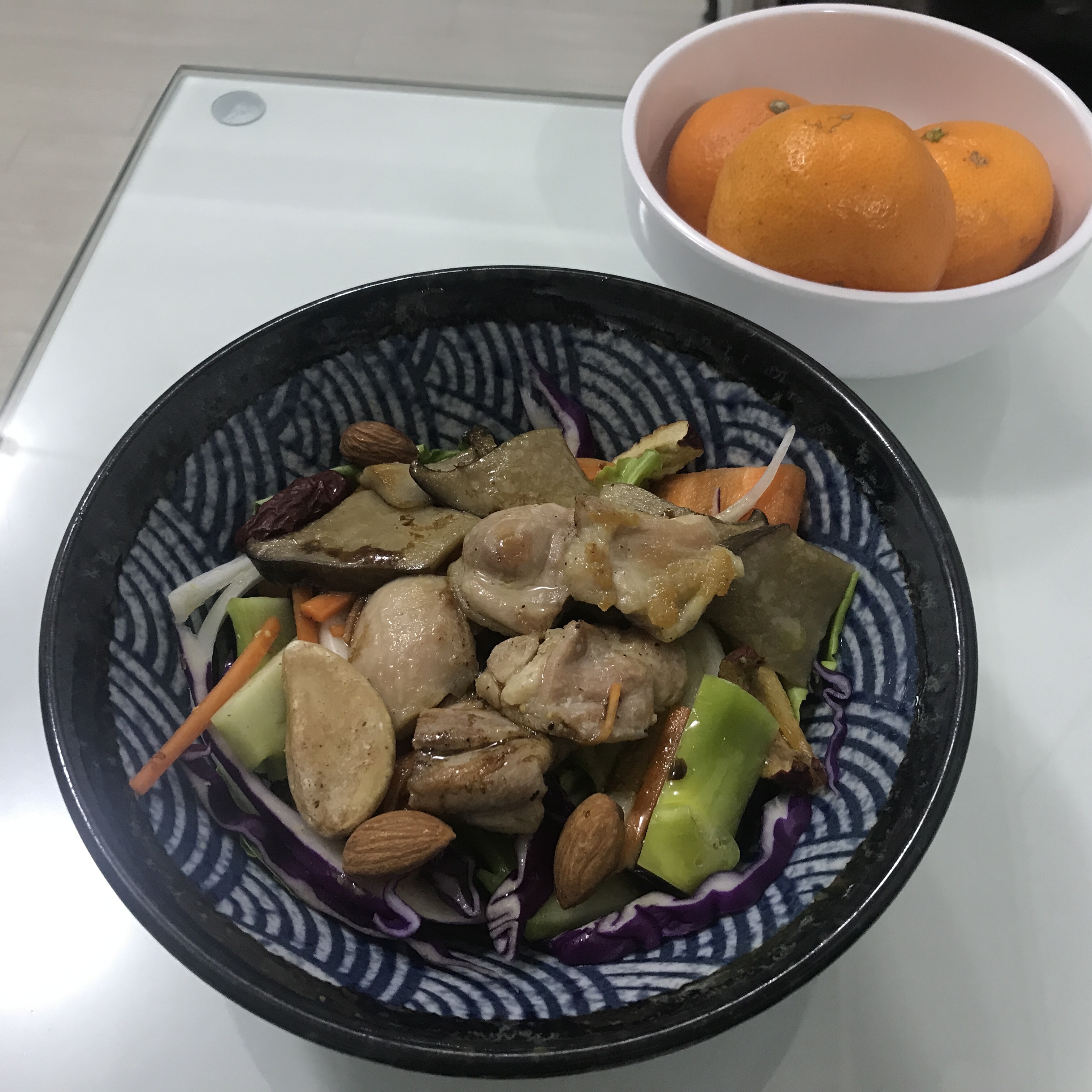 재료 : 닭다리살 송이버섯 브로컬리 구운아몬드 브라질호두 적양배추 당근 당근라페 그린올리브 쌈야채 버터헤드레터스 대추 건포도 디종홀그레인머스터드 올리브오일