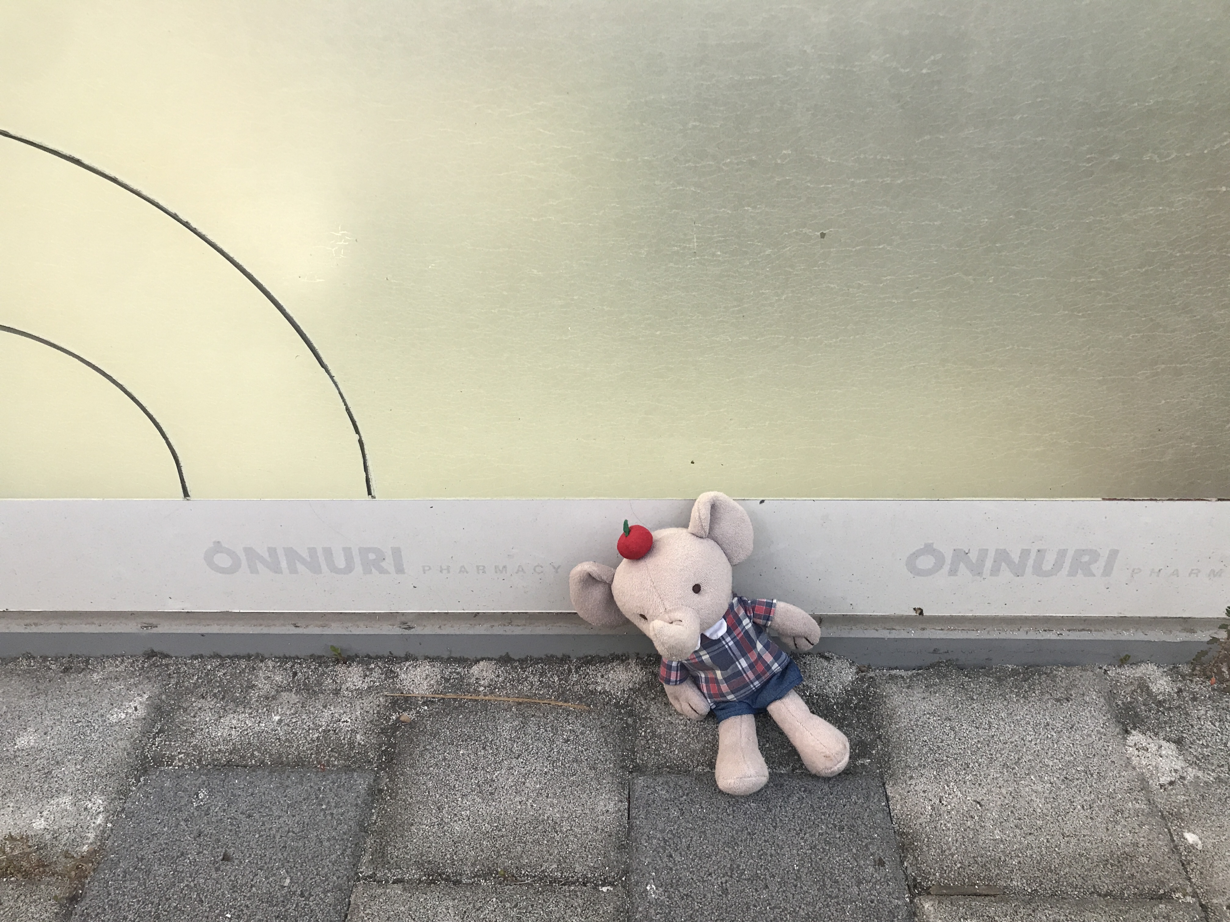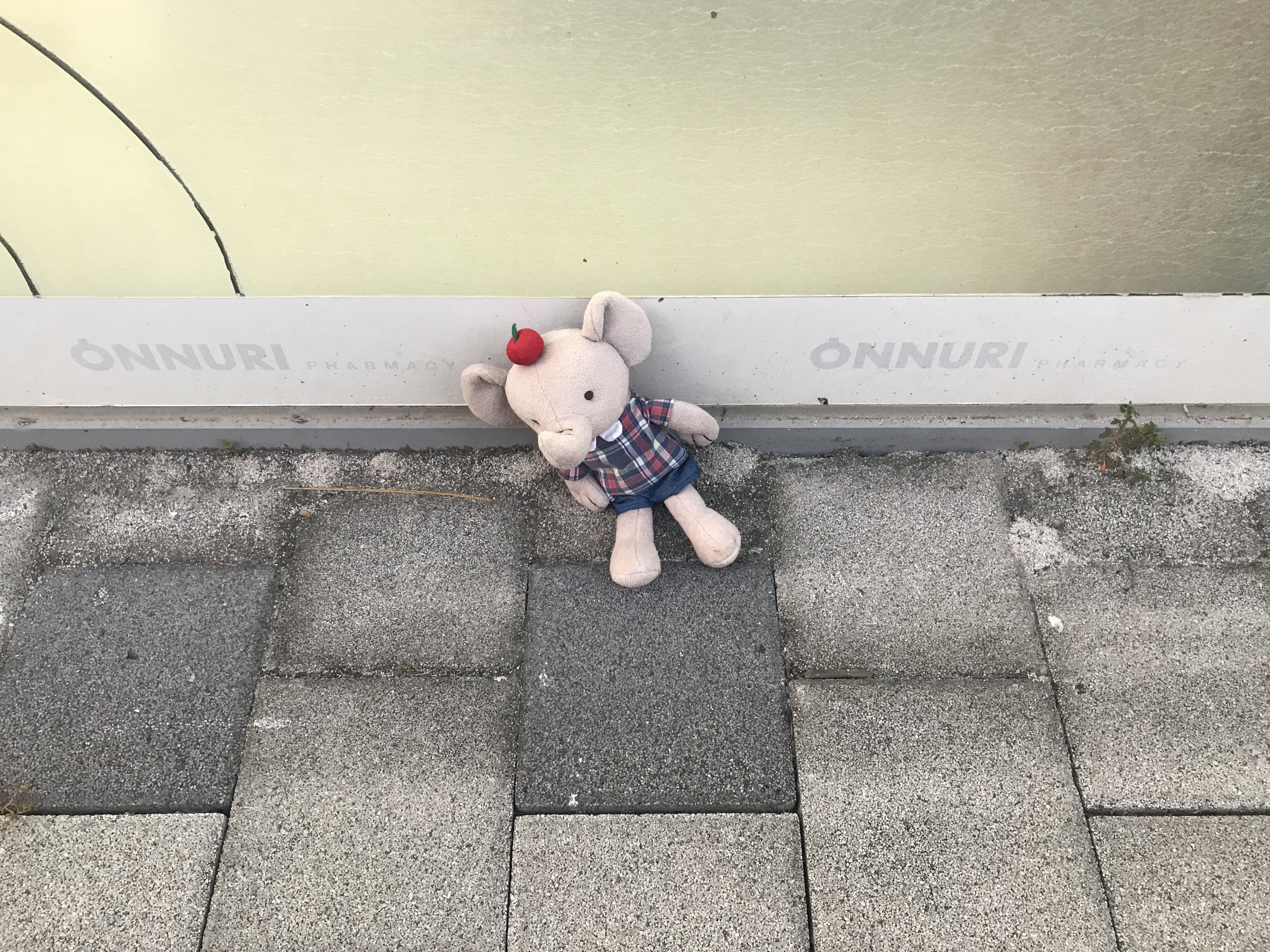 약국 앞에 ㅠㅠ 사과머리를 한 코끼리씨가 혼자 앉아있었다..주인이였을 꼬마아가씨가 애타게 찾고있을까?