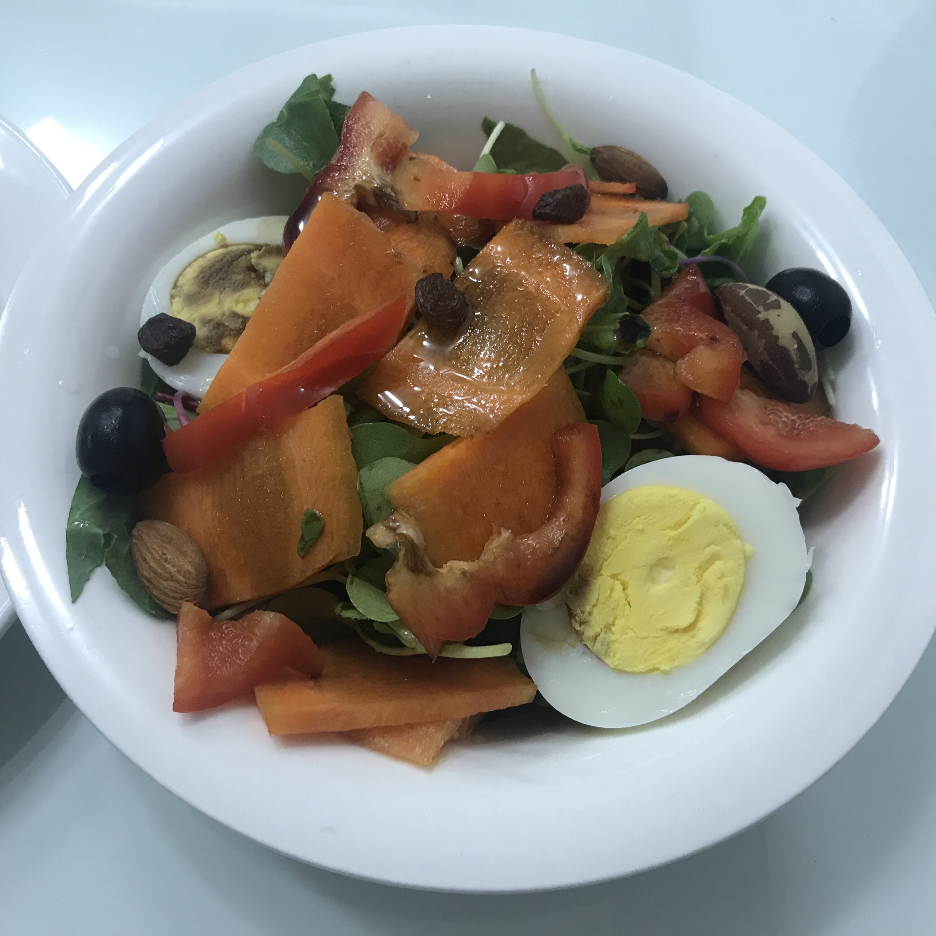 재료 : 닭 달걀(동물복지) 샐러드야채 당근 건포도 아몬드 브라질호두 블랙올리브 올리브오일 발사믹식초 홀그레인머스터드