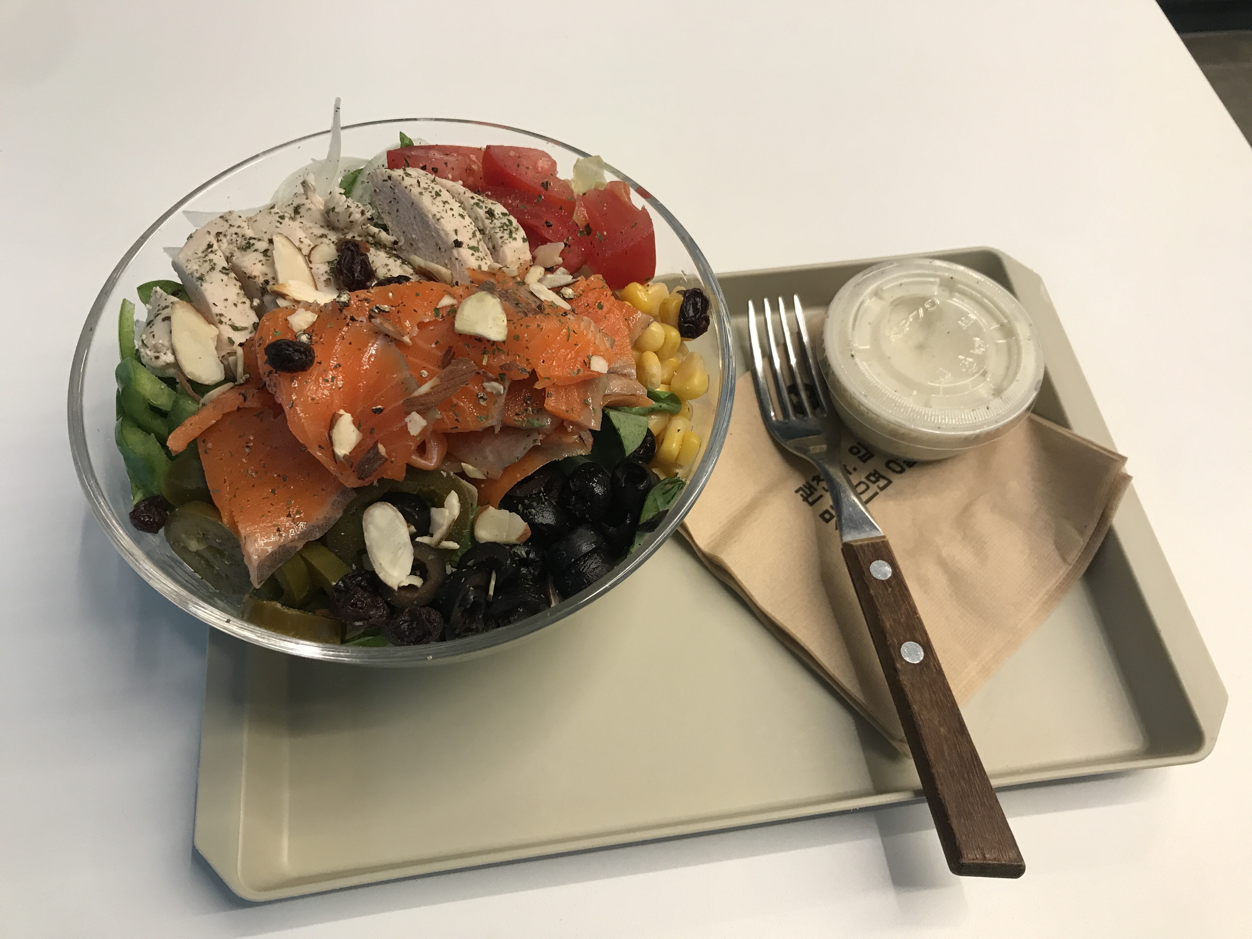 오늘은 연어샐러드에 로스트치킨 추가요.