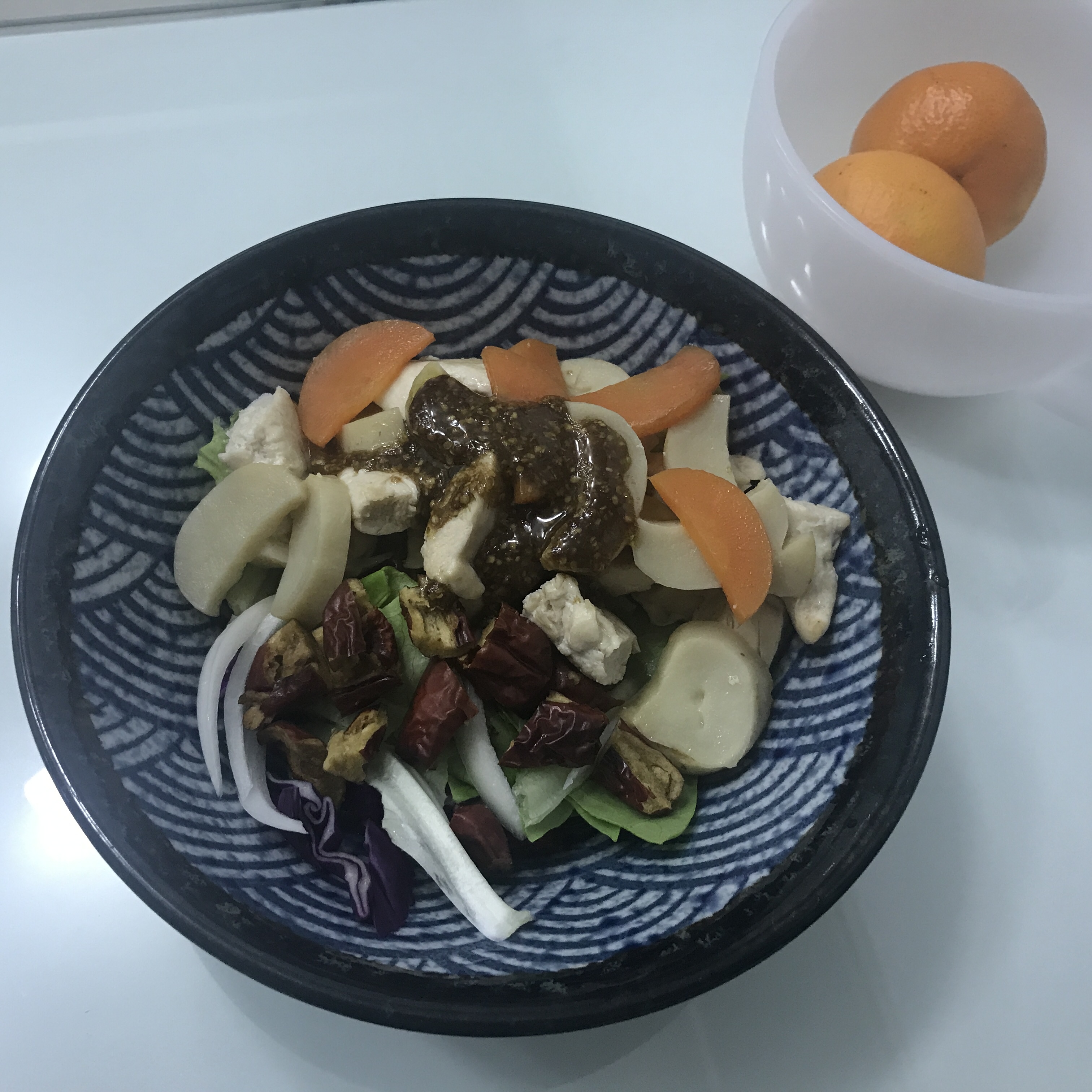 재료 : 닭안심 송이버섯 건대추 양파 적양배추 버터헤드레터스 당근 홀그레인머스터드 올리브오일 발사믹식초