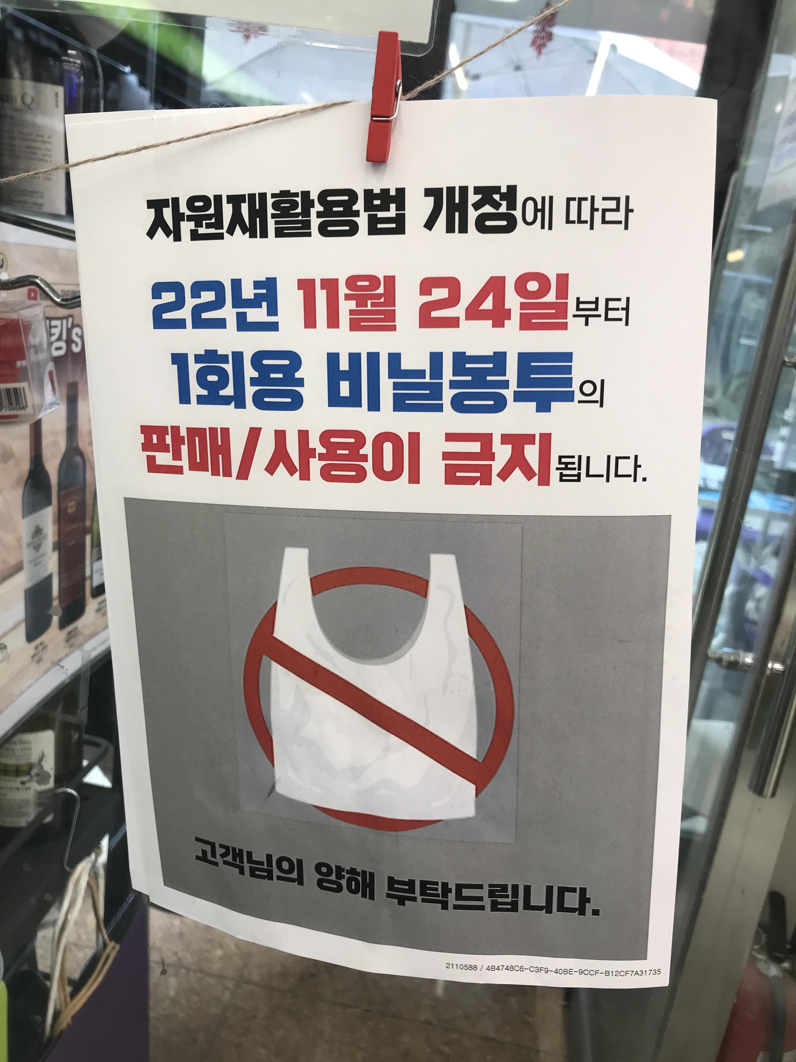 자주 가는 편의점에 자원재활용법 개정에 따라 2022년 11월 24일부터 1회용 비닐봉투 판매/사용이 금지라고 안내문이 붙어있었다 이제 편의점 갈때도 재활용 봉투 들고가는걸로~ 환경을 위해 실천하기 결코 쉽지않지만 하나씩 하나씩 부지런히 노력해보는걸로!