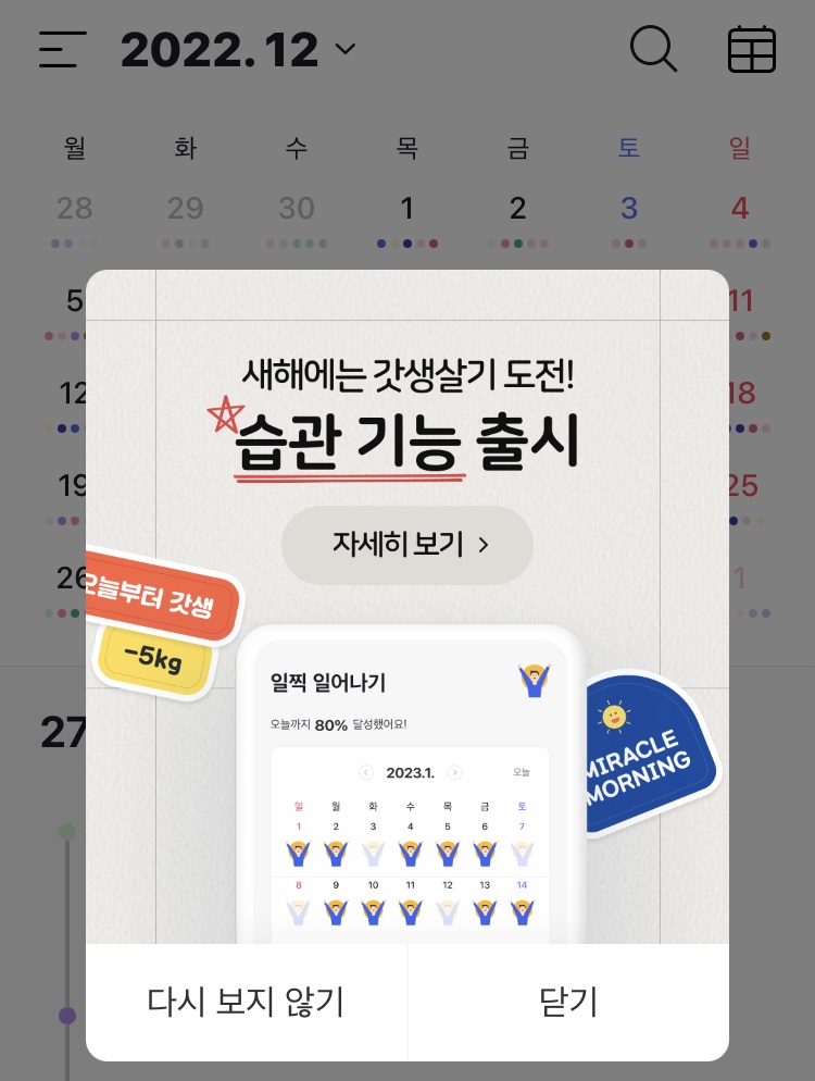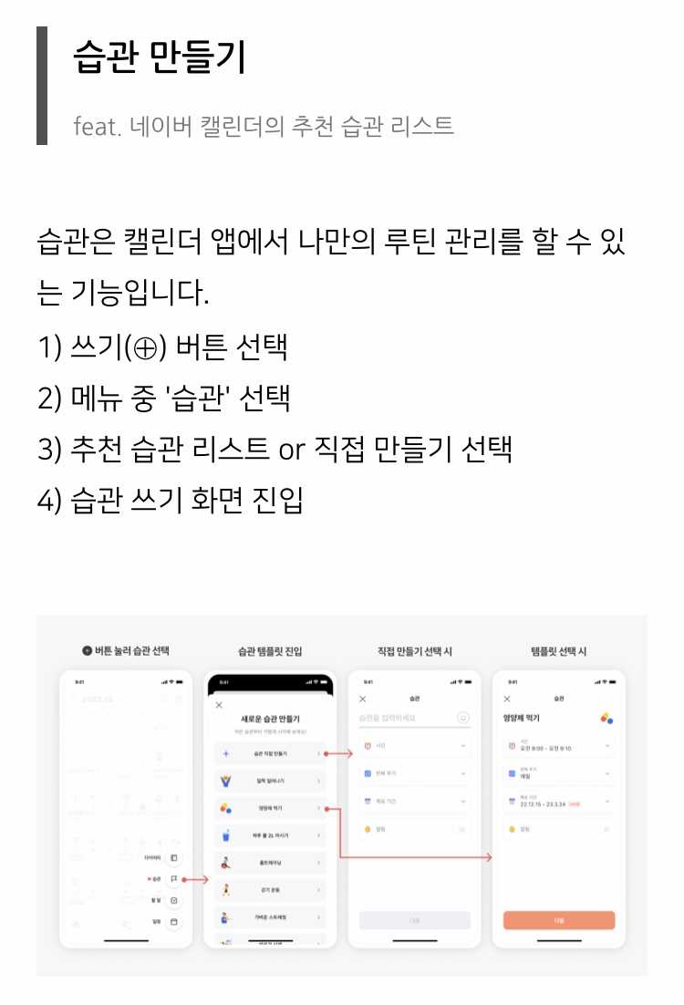 네이버 캘린더로 일정을 짜는 나에게 습관 기능 추가는 희소식! 루틴 관리가 잘 안되어 뭔가 성과가 눈에 보이지 않아 답답했는데 추가된 습관 기능을 사용해서 루틴을 재미지게 관리할수 있게 되었다 :) 땡큐베리감사