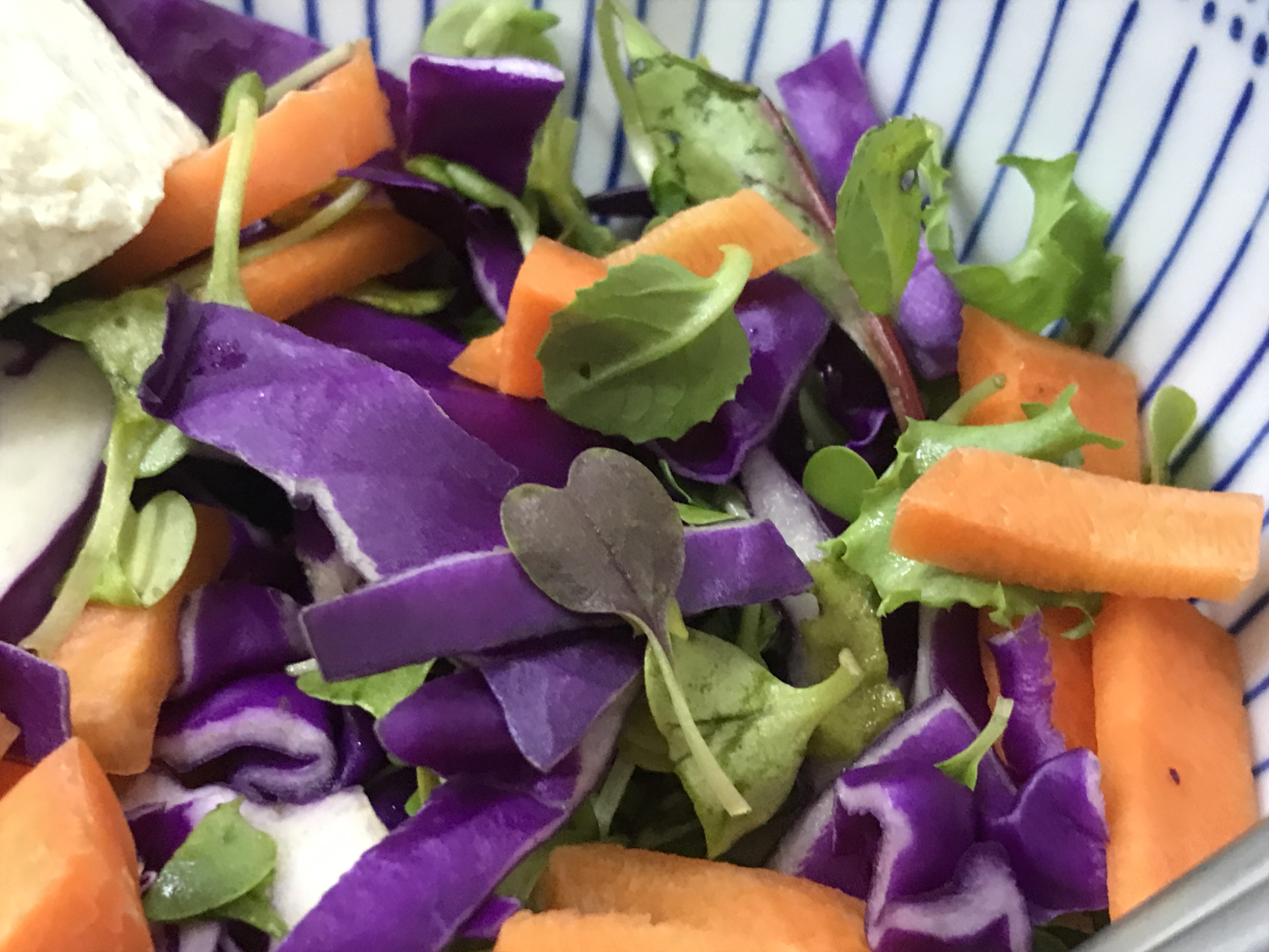두부랑 삶은 달걀 그리고 당근과 적채와 어린채소잎 듬뿍