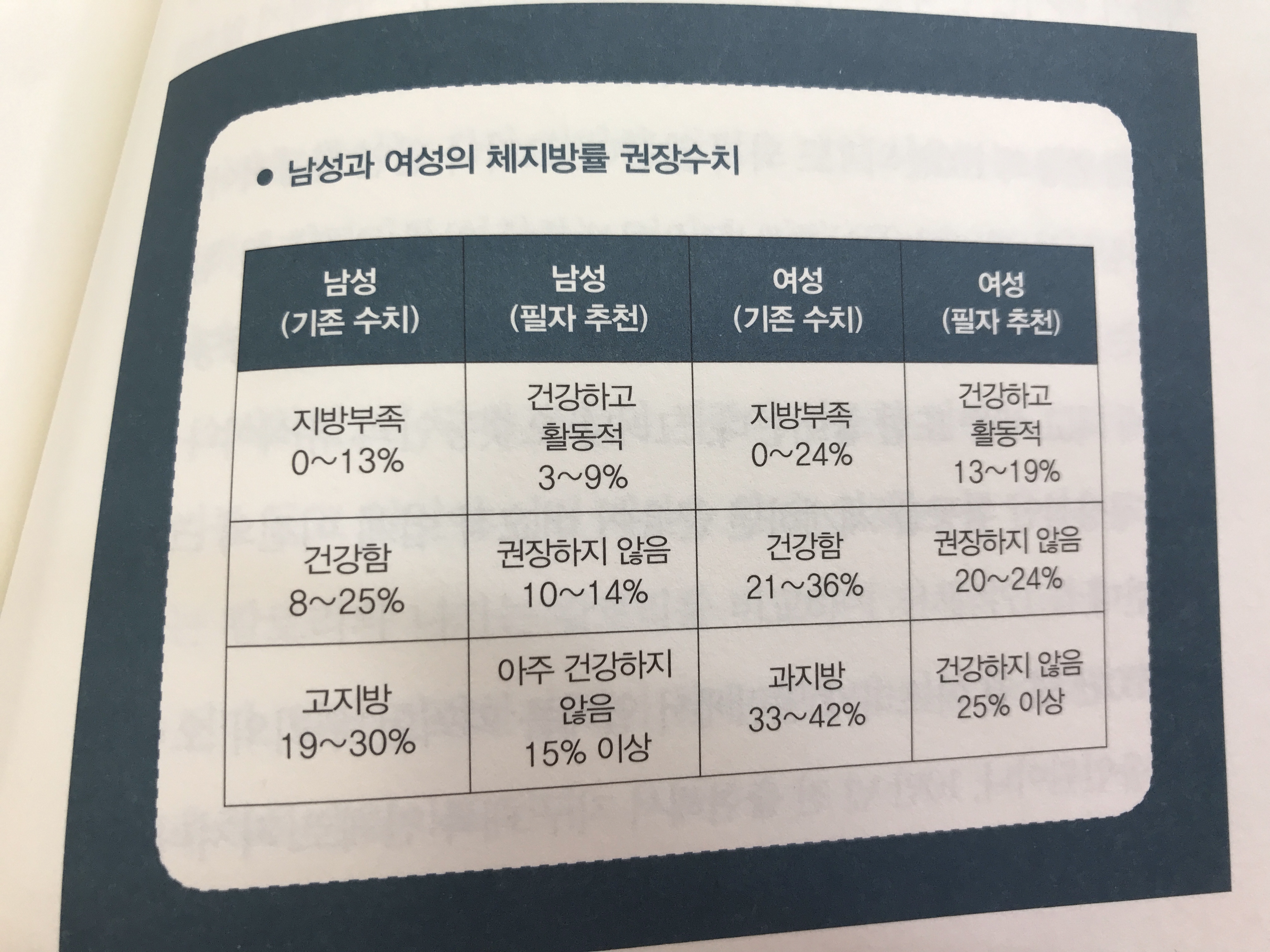 책 읽다보니 저자기준 체지방률 권장수치표가 나와있어 며칠전 측정했던 인바디 결과보고 비교해보니..