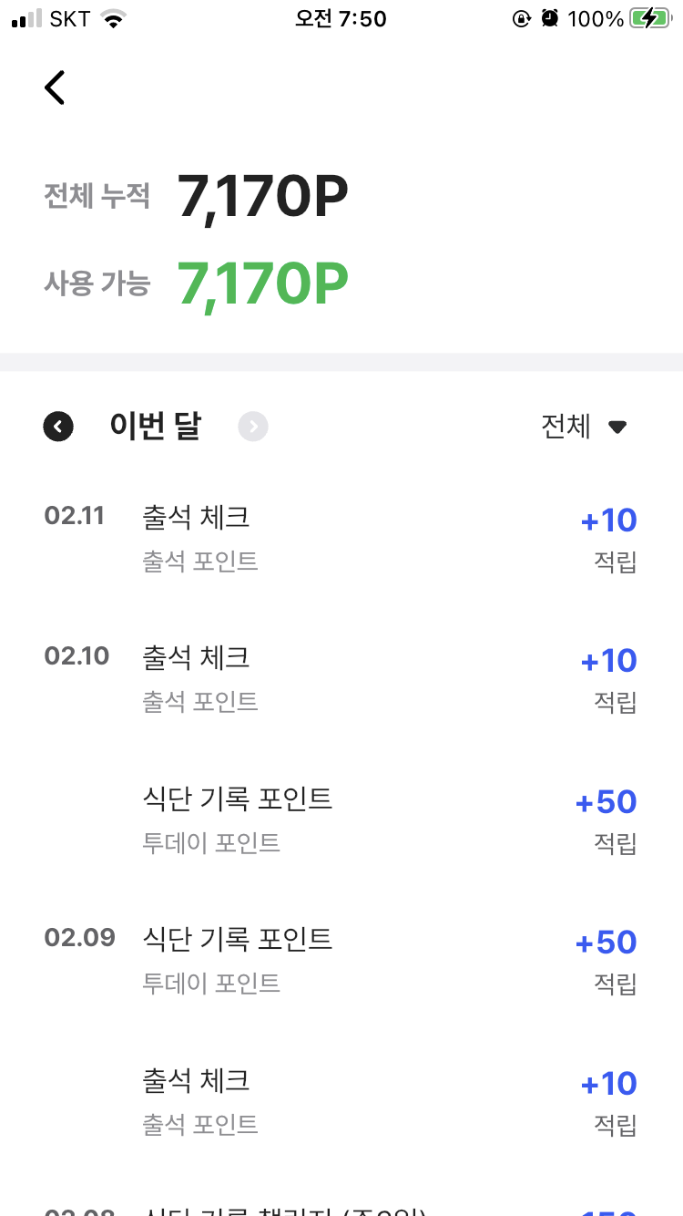 매일 출석체크하고 식사인증 그리고 주간퀴즈미션으로 쌓아가고있다 벌써 7170원!! :)