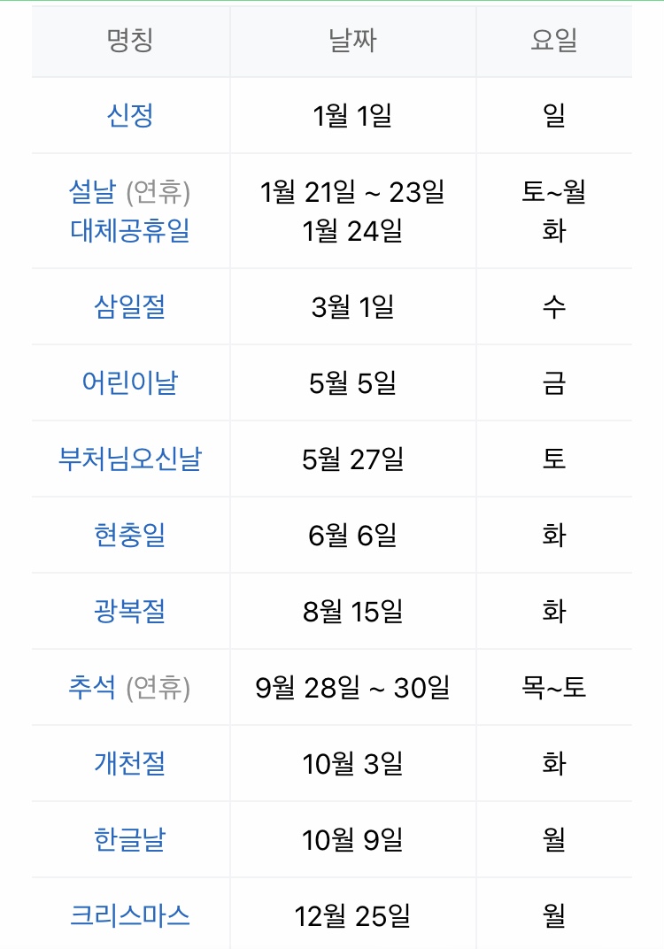 2023년 빨간날/공휴일/국가공휴일 날짜와 요일