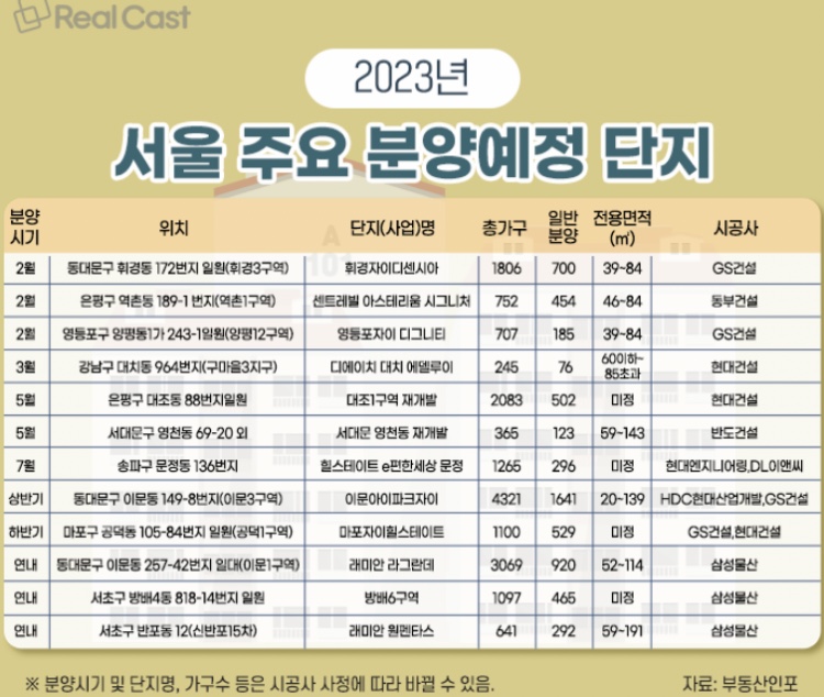 2023년 서울 주요 분양예정 아파트 단지 리스트