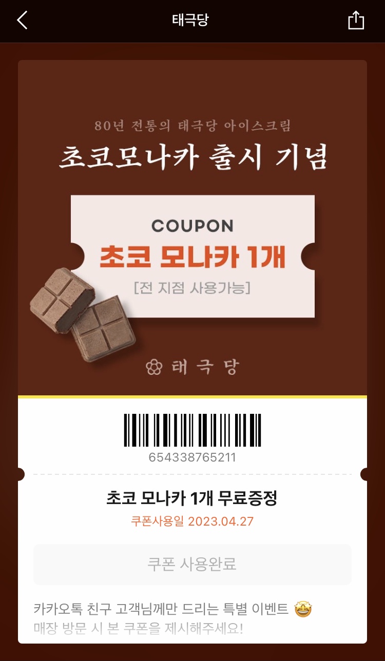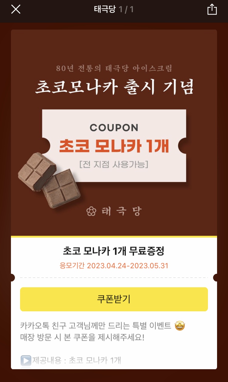 초코모나카 아이스크림 무료증정 쿠폰이 날라왔다