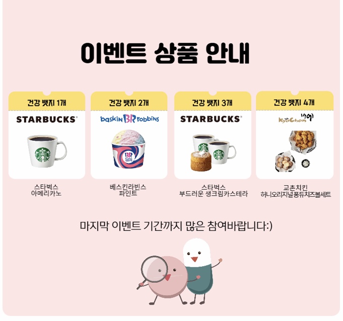 나 건강 뱃지 4개 받아서 교촌치킨 허니오리지널 퐁듀치즈볼세트 당첨 ㅋㅋㅋ