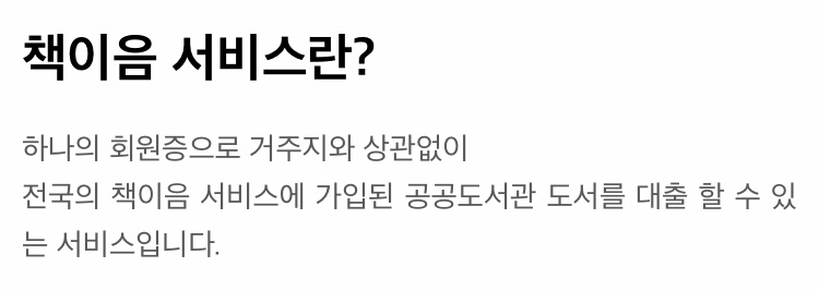 책이음 : 하나의 회원증으로 거주지와 상관없이 전국의 책이음 서비스에 가입된 공공도서관 도서를 대출 할 수 있는 서비스.