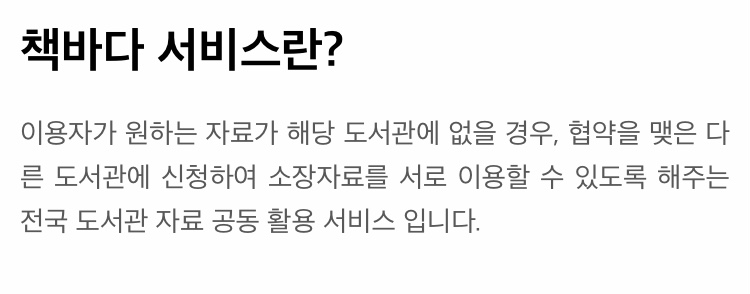 책바다 : 이용자가 원하는 자료가 해당 도서관에 없을 경우, 협약을 맺은 다른 도서관에 신청하여 소장자료를 서로 이용할 수 있도록 해주는 전국 도서관 자료 공동 활용 서비스